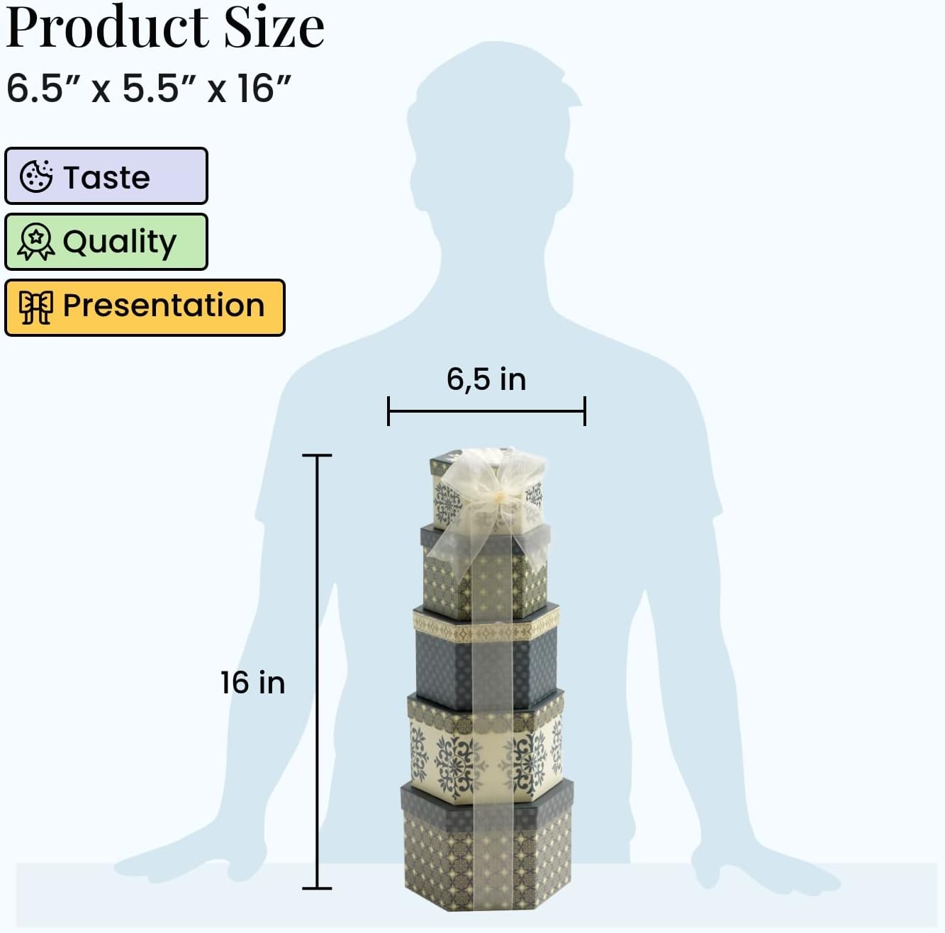 - REUSABLE CONTAINER: This gift tower measures 6" x 7" x 17" and includes 5 coordinating, stacked boxes. Reuse for decoration or storage for photos, mementos, and household items. Each gift includes a gift tag for a personalized touch.