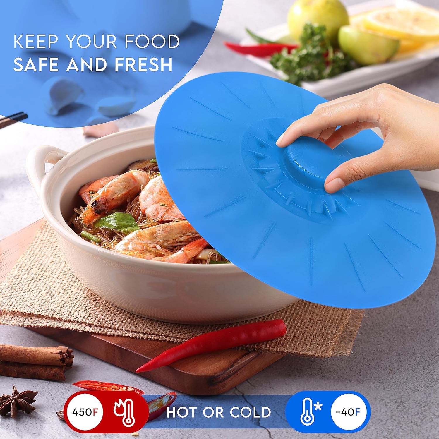 - YOU'LL LOVE HOW HANDY THESE ARE - Use them for the microwave, stove, oven, fridge or to serve food at the table indoors or outside. Our lids fit most smooth rimmed containers including stainless metal plastic and glass. You get a universal fit for cups, mugs, pots, fry pans, glasses and bowls up to 10”. Safe for cooking and food storage from -40F to 450F in sizes 5" 6" 7" 7.8" and 10.2".