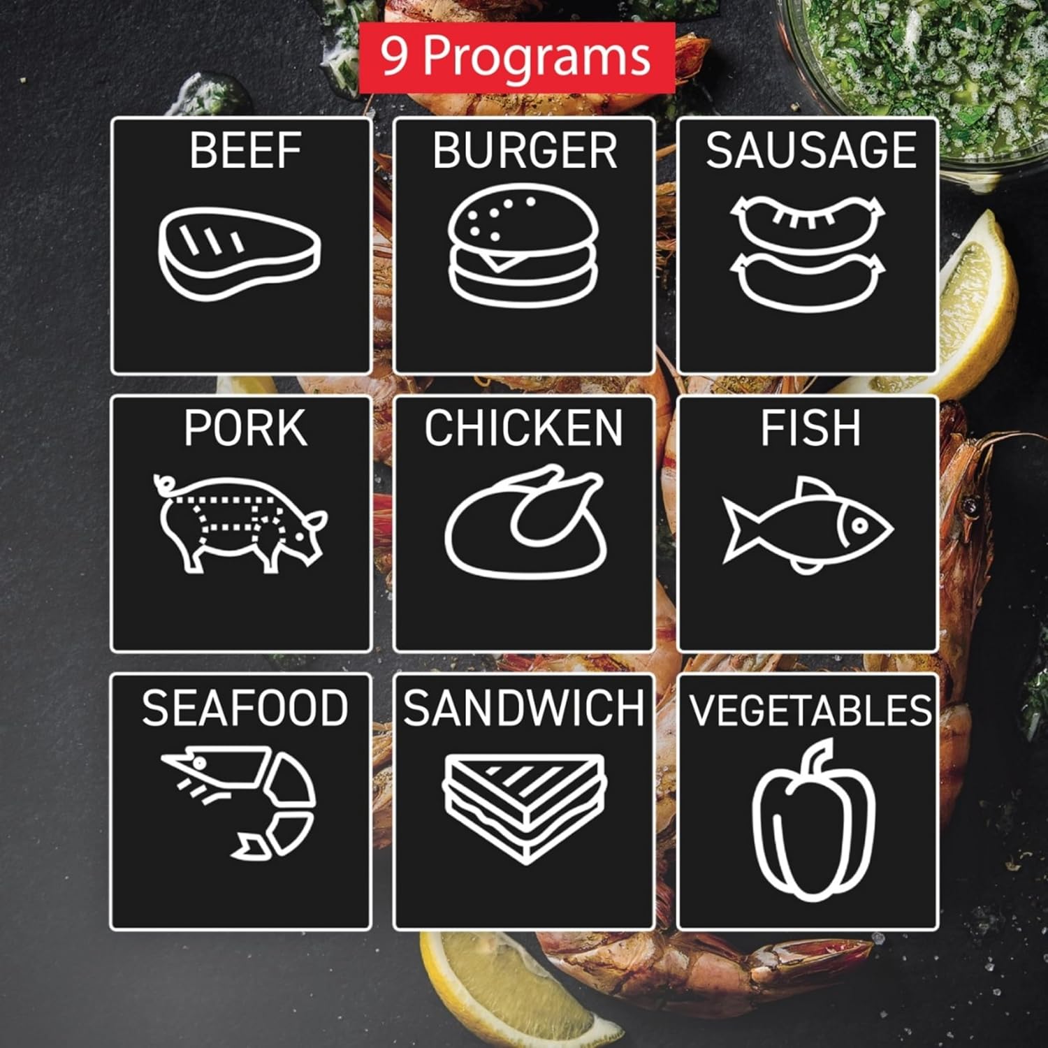 - 9 SMART COOKING PROGRAMS: Our PTFA nonstick indoor grill comes with nine pre-programmed settings for hamburger, poultry, fish, sandwiches and even more.