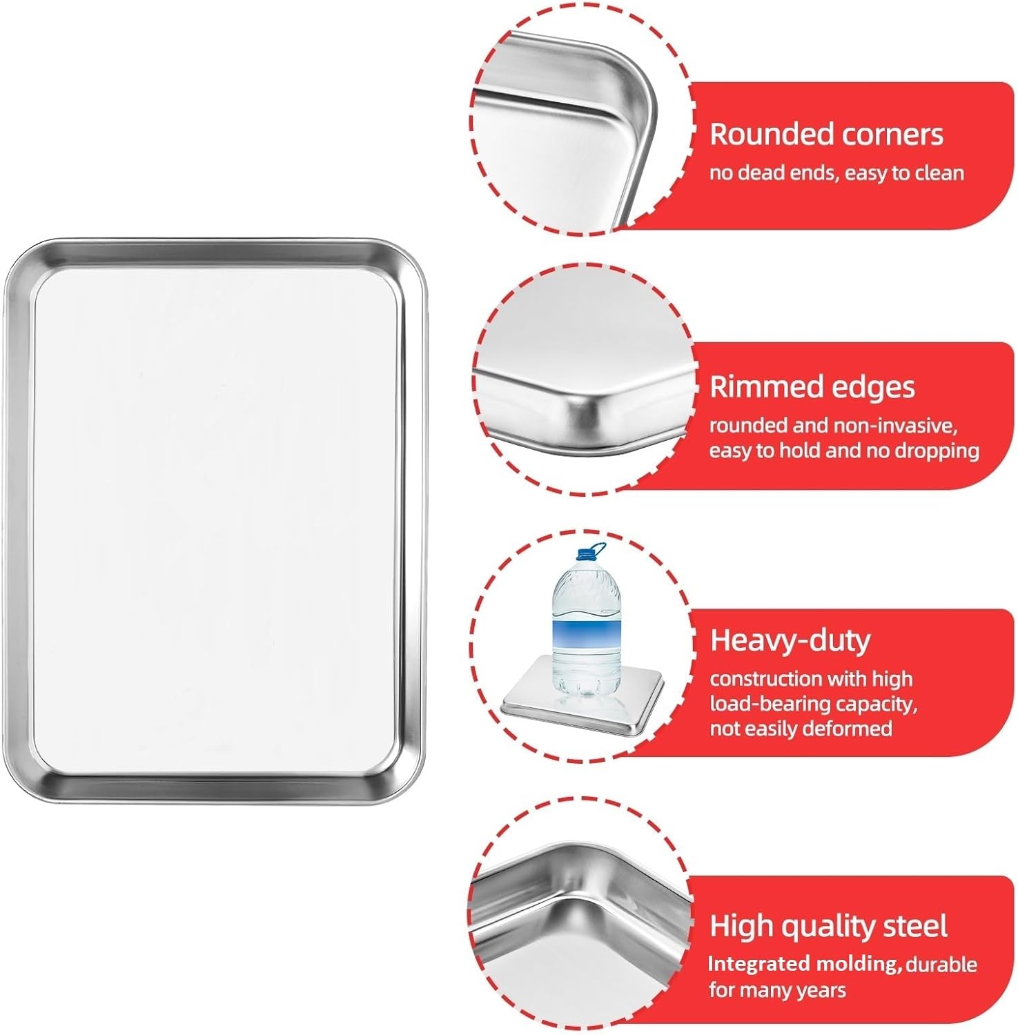 - EXQUISITE CRAFT: Our toaster oven pans has super finish mirror surface, easy to release food. 18/0 stainless steel, durable and not easy to wear. The smooth edges and rimless design prevents scratches and is hard to fall. The edge of the tray is rolled around a rectangular frame of steel wire, which pushes against the four sides and keeps the bottom flat, making sure your pan stays level and absorbs heat evenly