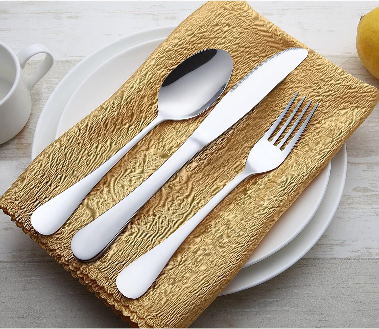- Classic & Elegant Design: Mirror polished, smooth and shiny, never need to be polished. Classic and elegant design without complicated patterns disturbing your table setting. Its sleek and simple looking can match ANY tableware. This set is a must-have basic silverware for the family