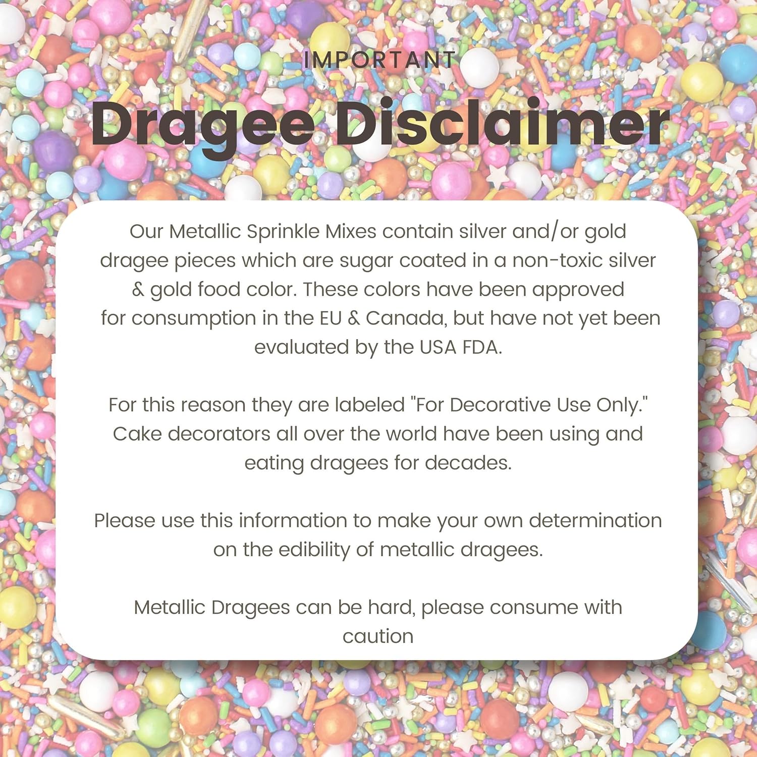 - Metallic Dragees Disclaimer: Silver and gold dragees are commonly used by cake decorators worldwide. While approved for consumption in some regions, they are traditionally labeled as “For Decorative Use Only” in the U.S. Please use discretion when adding them to your creations