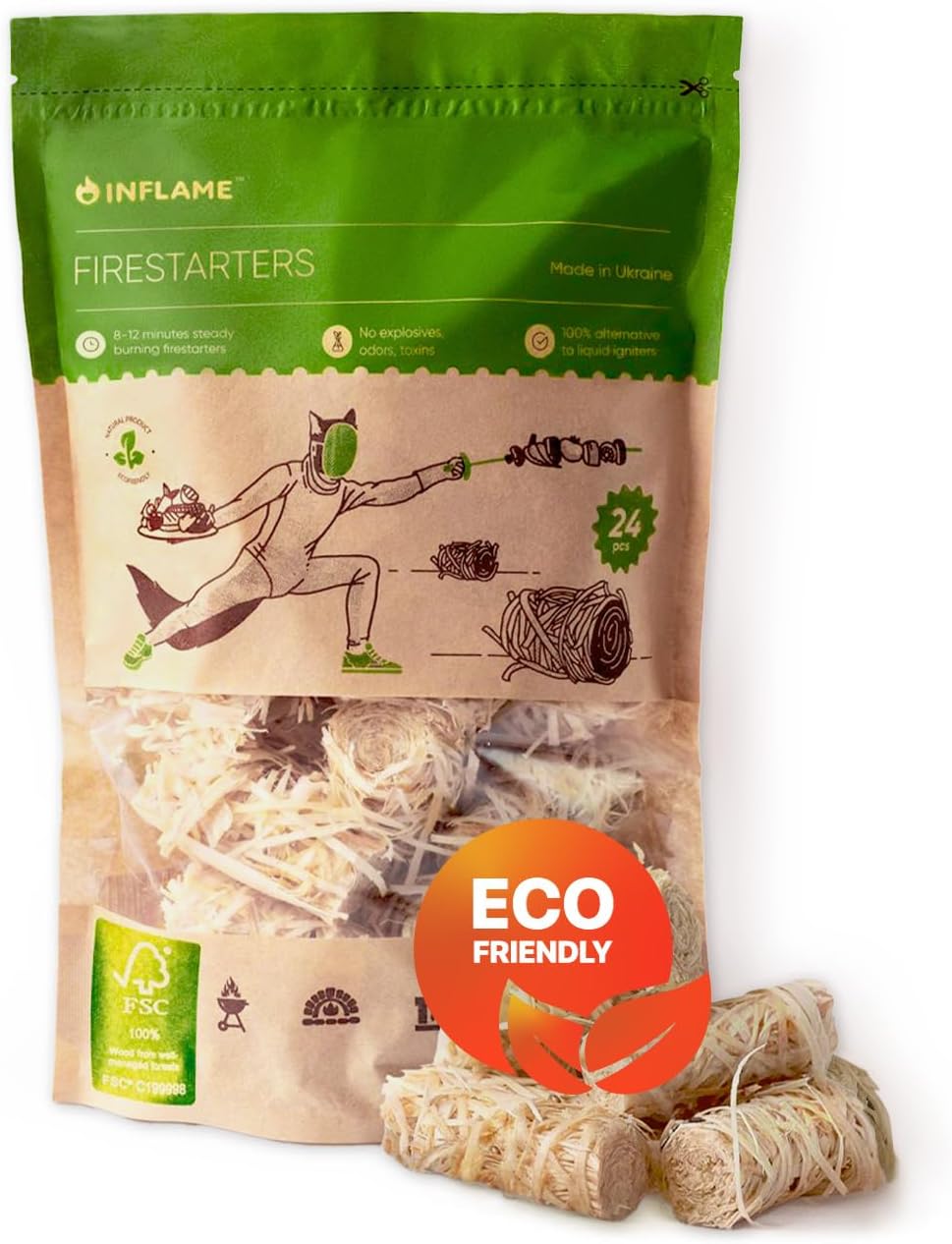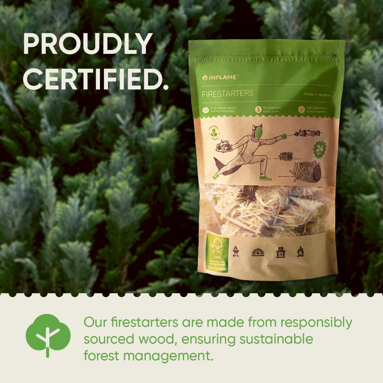 Inflame Fire Starters for Campfires, Grill, BBQ, Fireplace, Woodstove - Charcoal Starter - Waterproof, Weather-Resistant - Natural Wood Fireplace Starters - 24 pcs