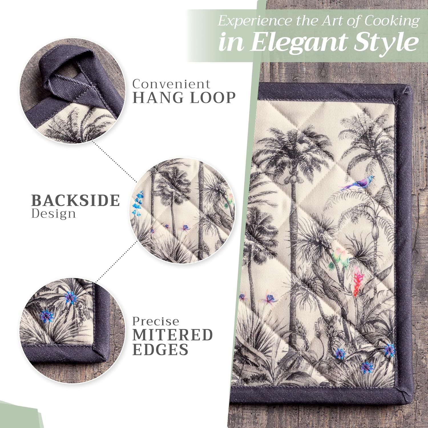 - Artistic style: Add charm to your kitchen with our oven mitt pot holder set featuring watercolor designs inspired by traditional European motifs. Stylish and functional kitchen accessories for every home cook or gift occasion.