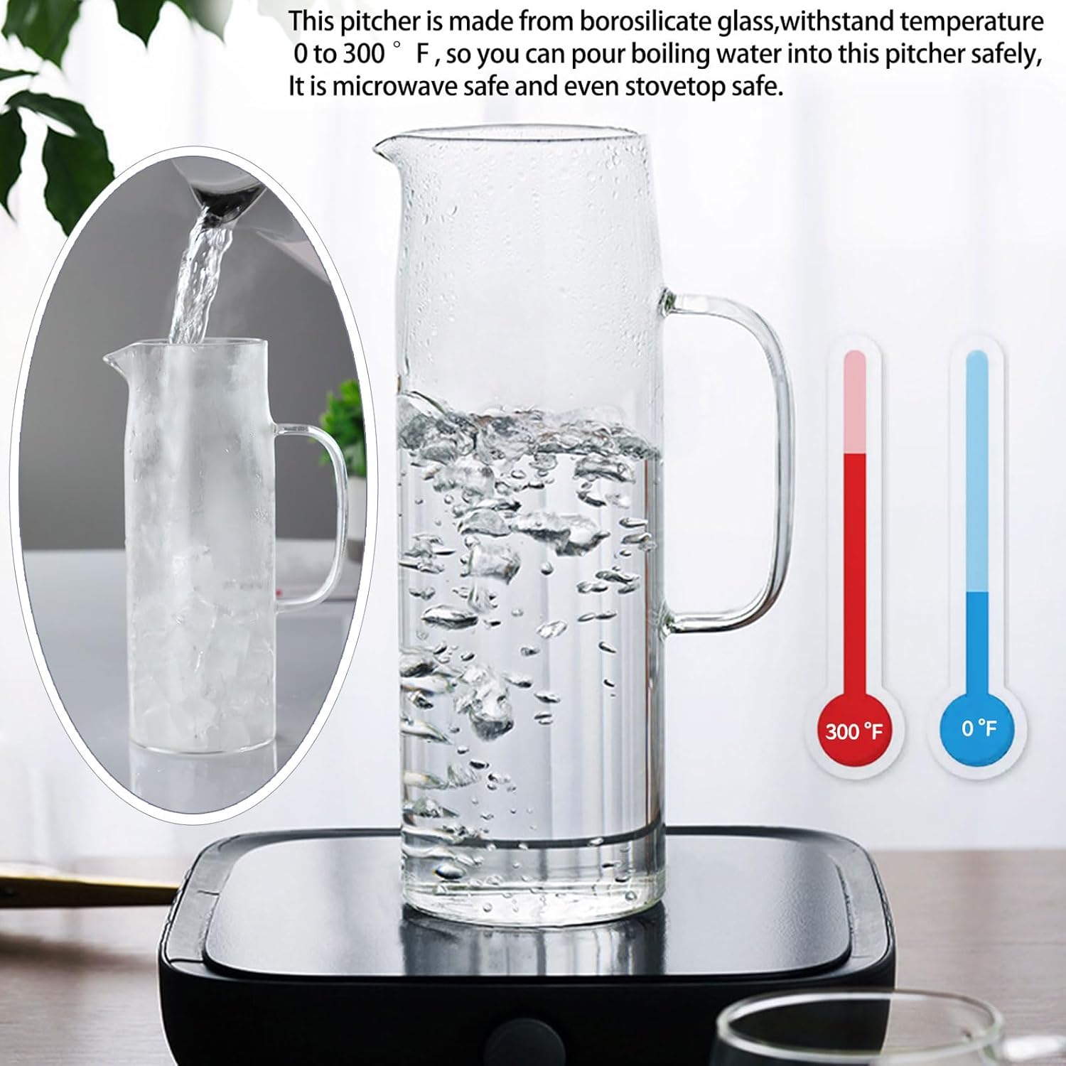 - Heat-resistant Borosilicate Glass Pitcher - This water pitcher is made from borosilicate glass, withstand temperature 0 to 300 ℉, so you can pour boiling water into this pitcher safely. NOTE : Each glass pitcher with a non-slip pad, which can be picked up freely .if use the pitcher for boil water on the stove, please remove the lid and pad.