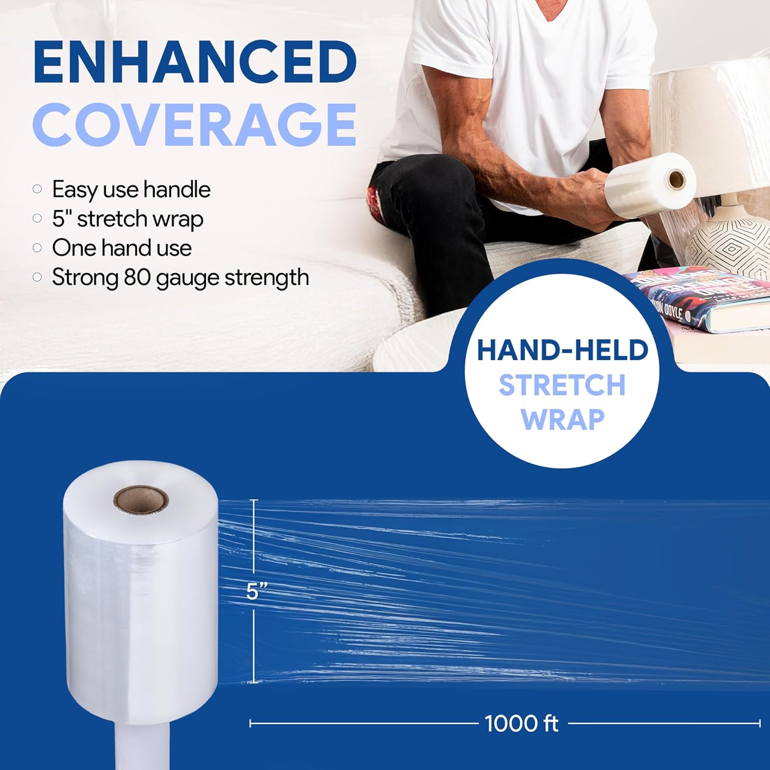 - CONQUER MOVING DAY: Wrap, bundle, and secure all your belongings with ease using this 2 pack of 5" x 1000 ft stretch film with smooth handles. Move with confidence knowing your items are protected!