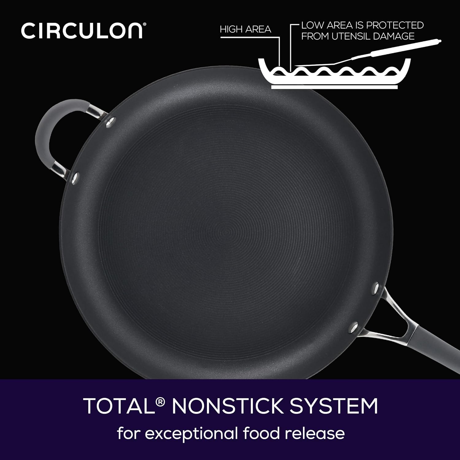 - ENHANCED NONSTICK FRYPAN: Extra large skillet boasts the TOTAL Nonstick System of raised circles and premium nonstick for natural food release and easy cleanup that lasts 10 times longer than normal nonsticks