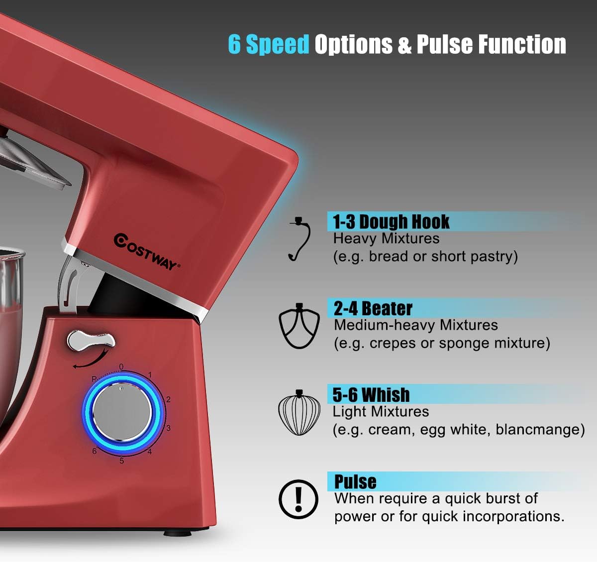 - TILT-HEAD & ANTI-SLIP DESIGN------The tilt-head design mixer allows access to install or uninstall bowl and its attachments easily by an easy-to-control knob, which also convenient for you to add ingredients for a recipe. Anti-slip suction cups are specially designed to keep mixer balanced and steady while working.