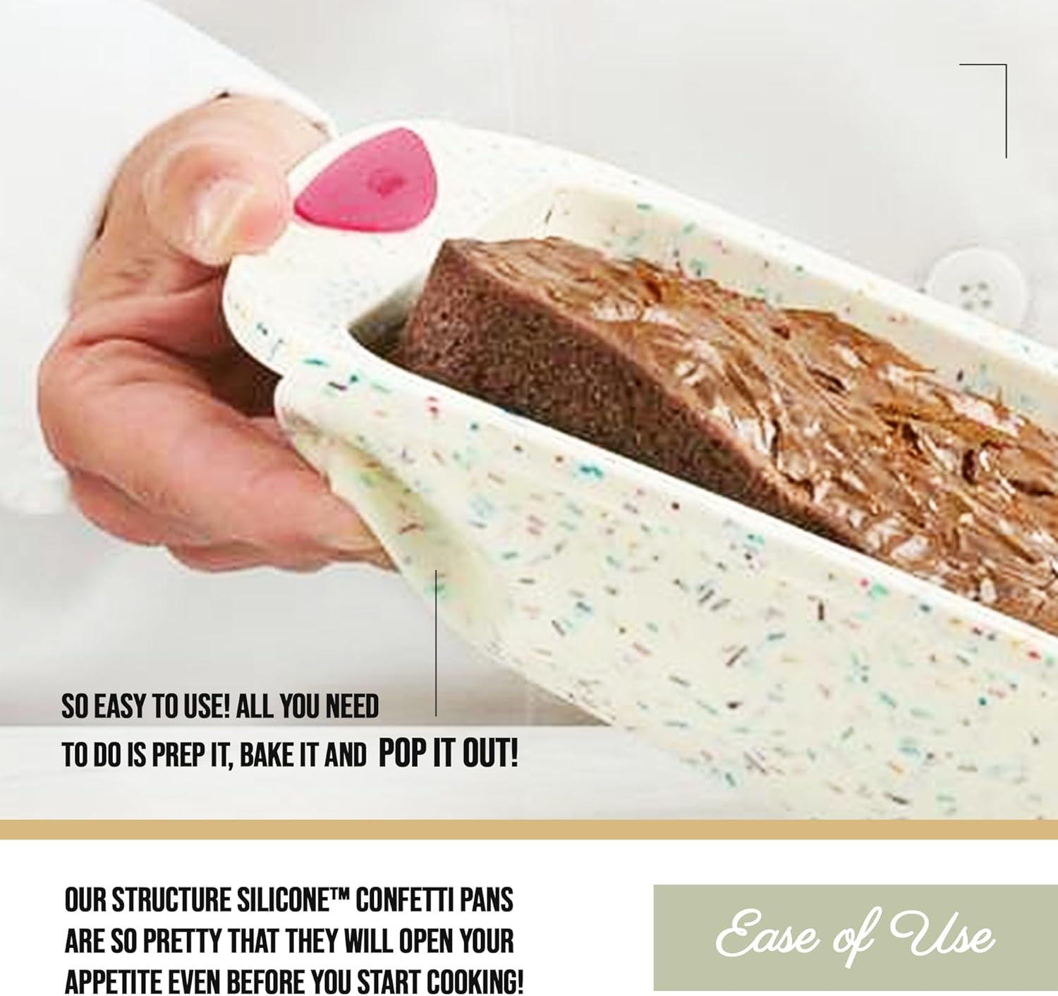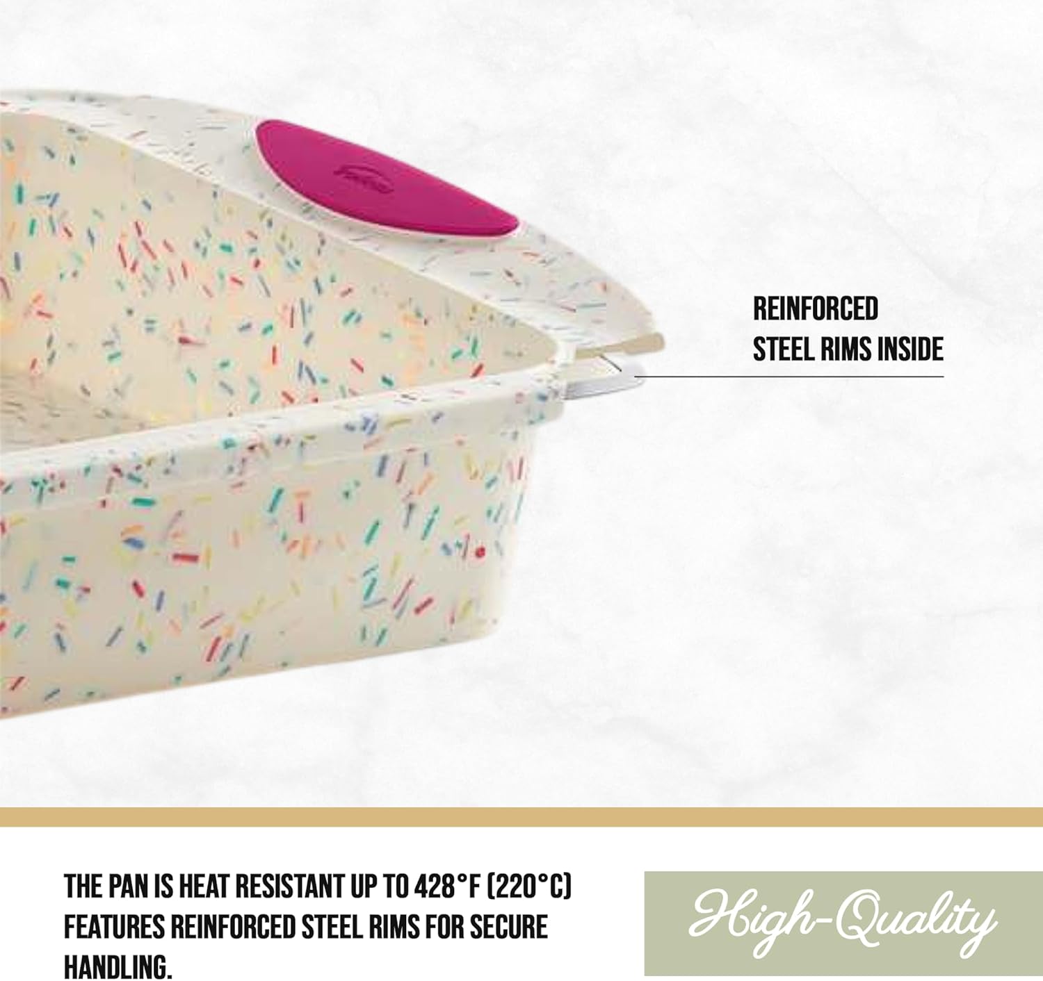 - Perfect baking every time; our confetti with fuchsia square cake pan combines the stability of metal bakeware with the flexibility, nonstick performance and quick cleanup of silicone