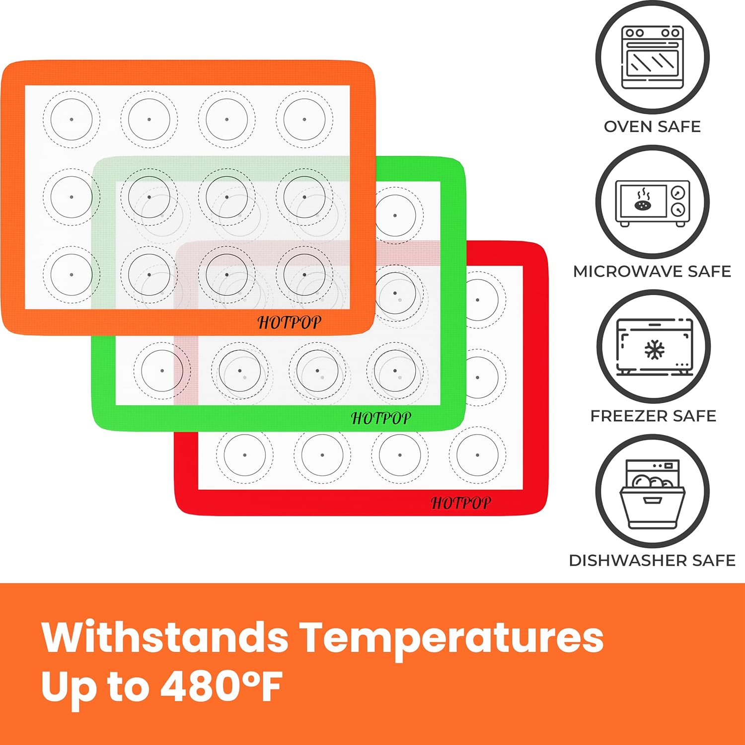 HOTPOP Silicone Baking Mats 0.75mm - Non-Stick Silicone Sheets for Bake Pans and Rolling with Outlines for Pastries - Silicone Baking Sheet - Macaron/Pastry/Cookie/Bun/Bread Making (3 QUARTER SIZE)