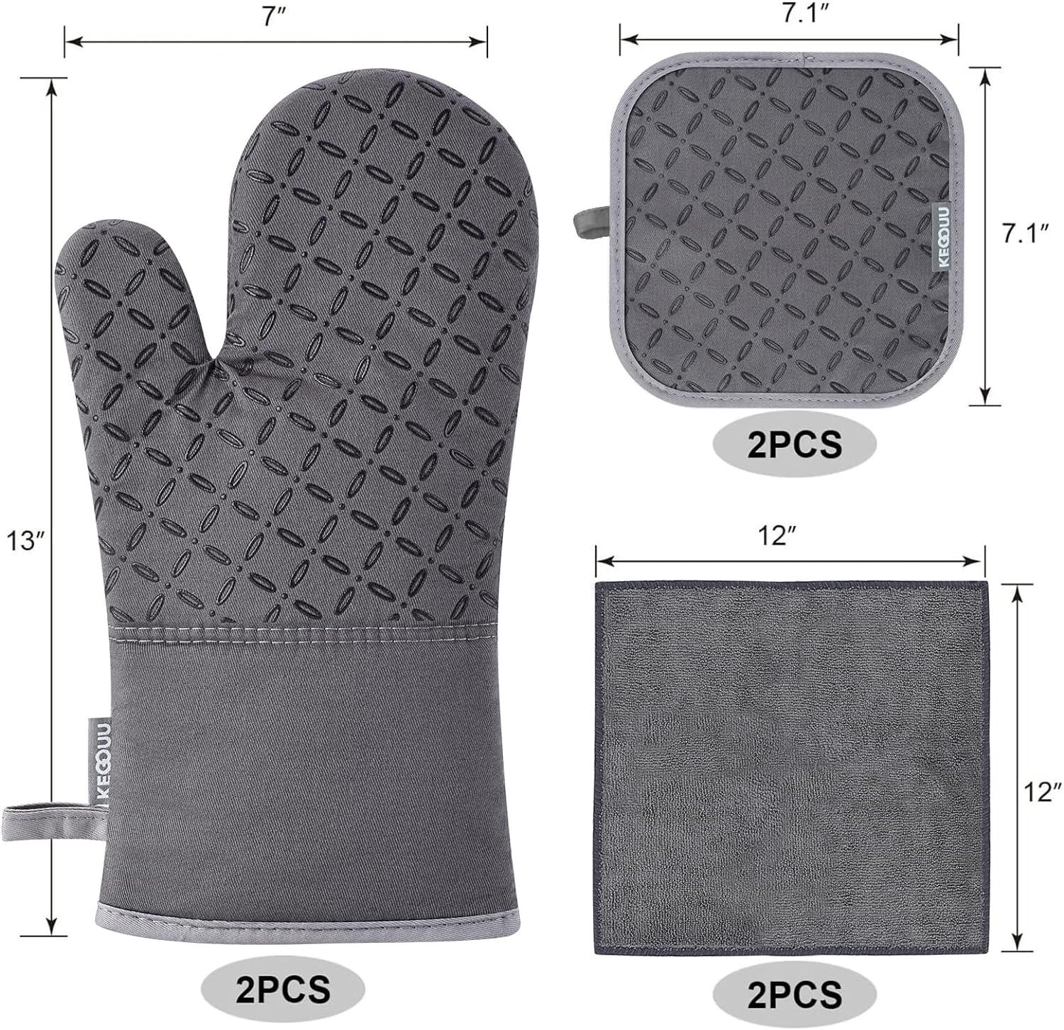 KEGOUU Oven Mitts and Pot Holders 6pcs Set, Kitchen Oven Glove High Heat Resistant 500 Degree Extra Long Oven Mitts and Potholder with Non-Slip Silicone Surface for Cooking (Grey)