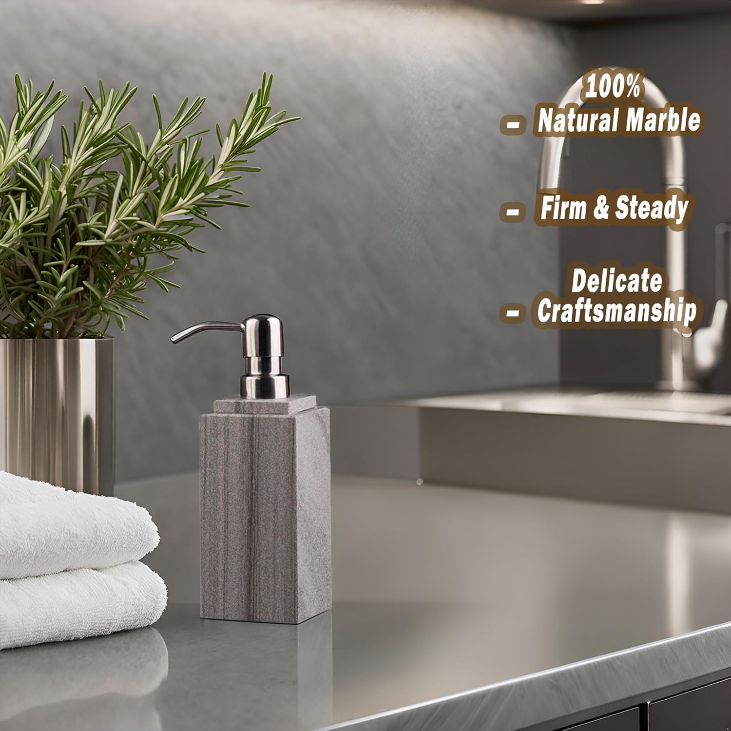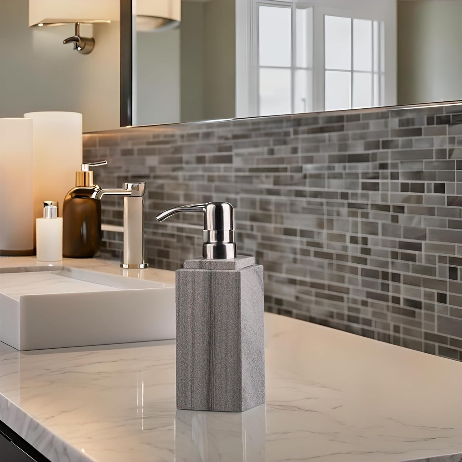 Hand Liquid&Lotion Soap Dispenser Pump Bottle Natural Marble for Kitchen Bathroom Countertop Laundry Room Holds Dish Soap Shampoo Laundry Liquid Shower Gel (Grey Sand)