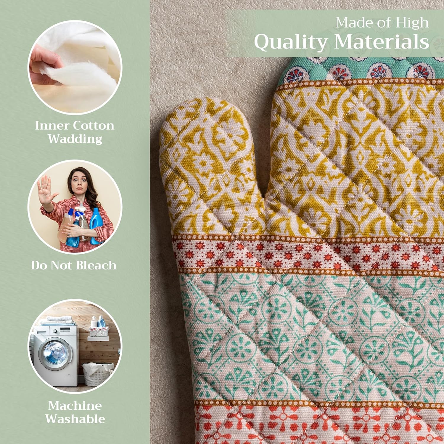 - 100% Quilted cotton: Crafted from thick, durable quilted cotton, this heat resistant oven mitt provides a soft feel, safe handling, and lasting performance. A must-have kitchen accessory for everyday cooking, roasting, or baking tasks