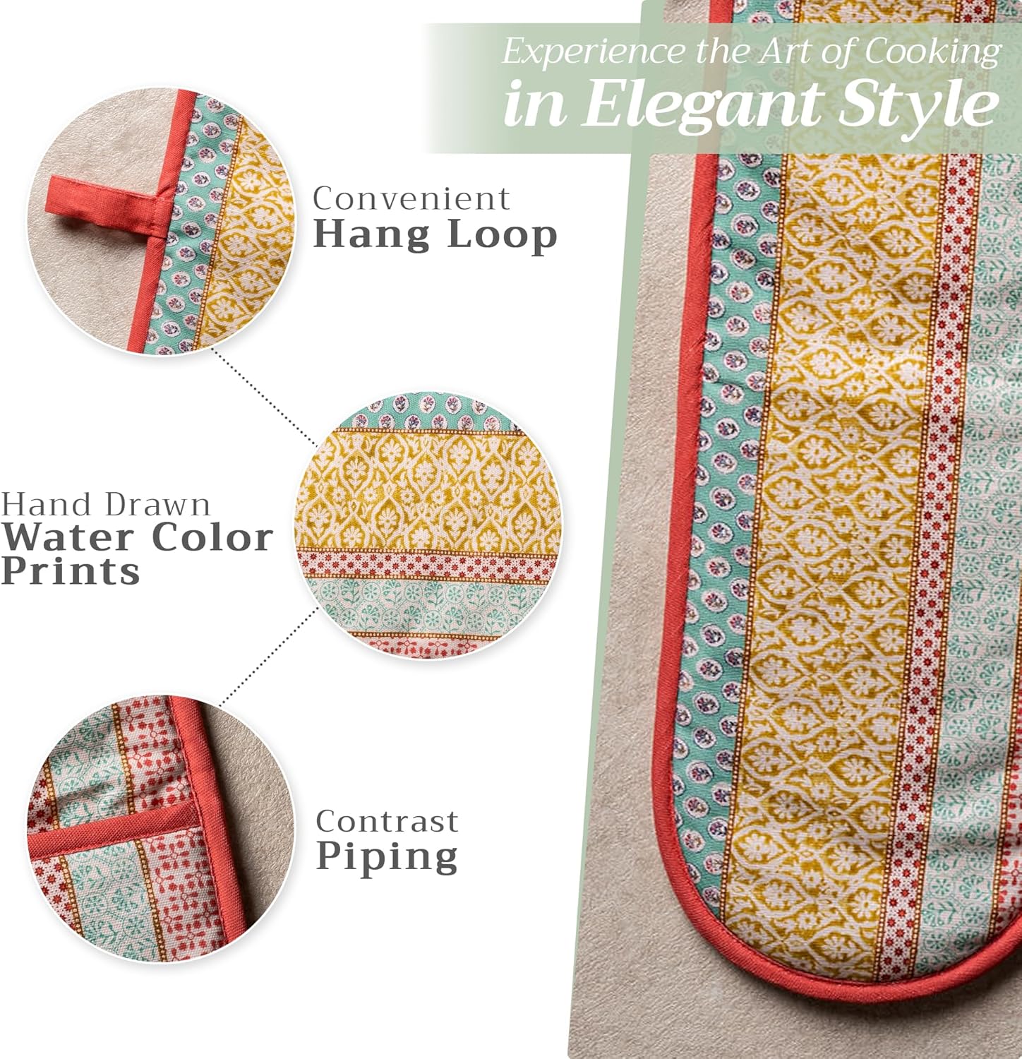 - Package includes: Includes 1 double oven mitt sized 7"x35". Perfect for handling hot cookware safely while adding a touch of European elegance to your kitchen. Designed in Europe and made in India with care
