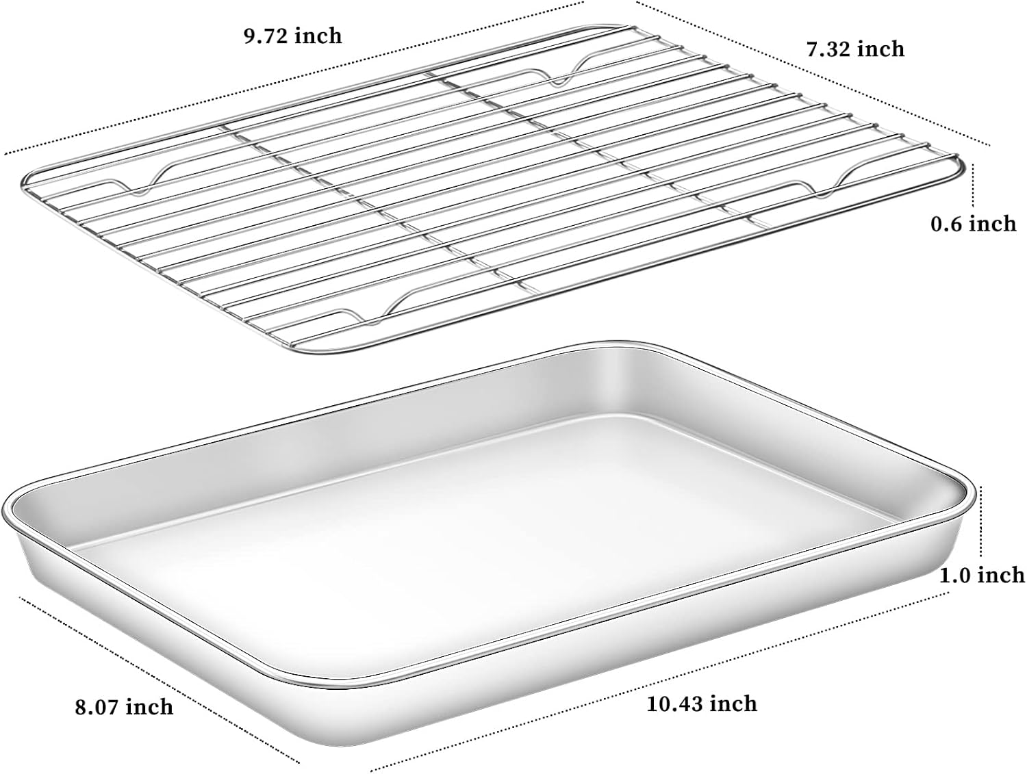 - 🍬 [CLASSIC SET FOR BAKING] You will get 4 pieces, including 2 baking sheets - 10.43 x 8.07 x 1 inches and 2 cooling racks - 9.72 x 7.32 x 0.6 inches, apply to regular oven and toaster oven. Sheet pans are used for baking and cooling rack set can be used separately or together since the cooling rack fits perfectly into the half sheet pan.