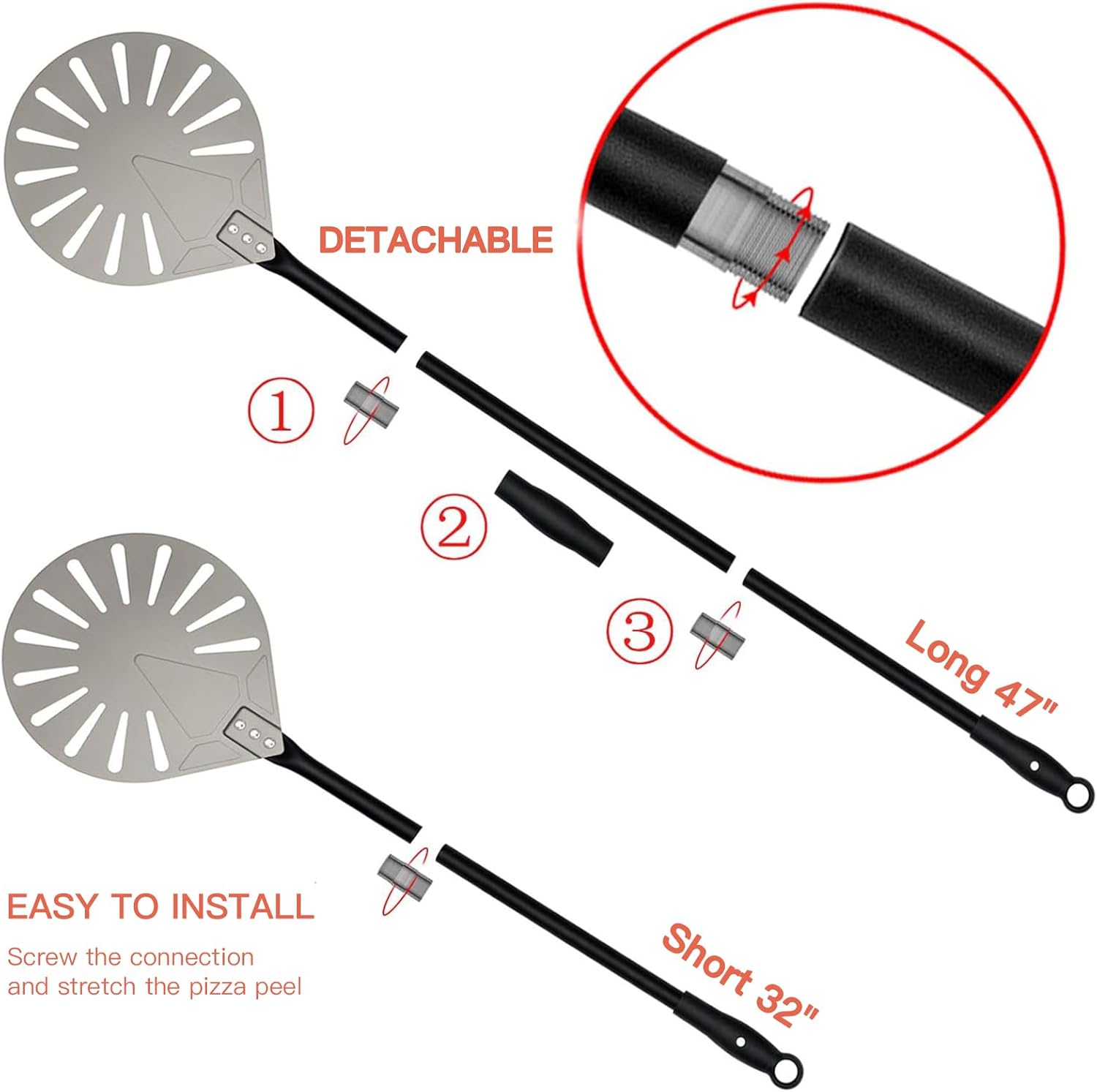 - 【Long Handle】The 47-inch (120 cm) aluminum turning pizza spatula allows you to easily rotate your pizzas, breads, or pies in hot ovens. The 37-inch long handle and sliding grip design solve the problems of unsafe use, looseness and easy slipping during baking