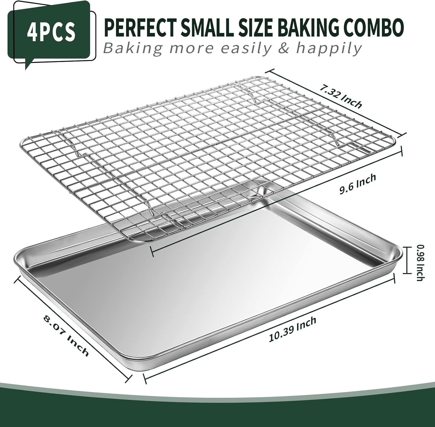 - Small Size Perfect and Complete Set: CEKEE small cookie sheets with wire rack sets are 4 PIECES , which includes 2 small cookie pan: 10×8×1 Inch, 2 small Cooling Racks: 9.6×7.32 Inch. This cookie sheet set is perfect combo, which can help you for baking or cooking favorite food