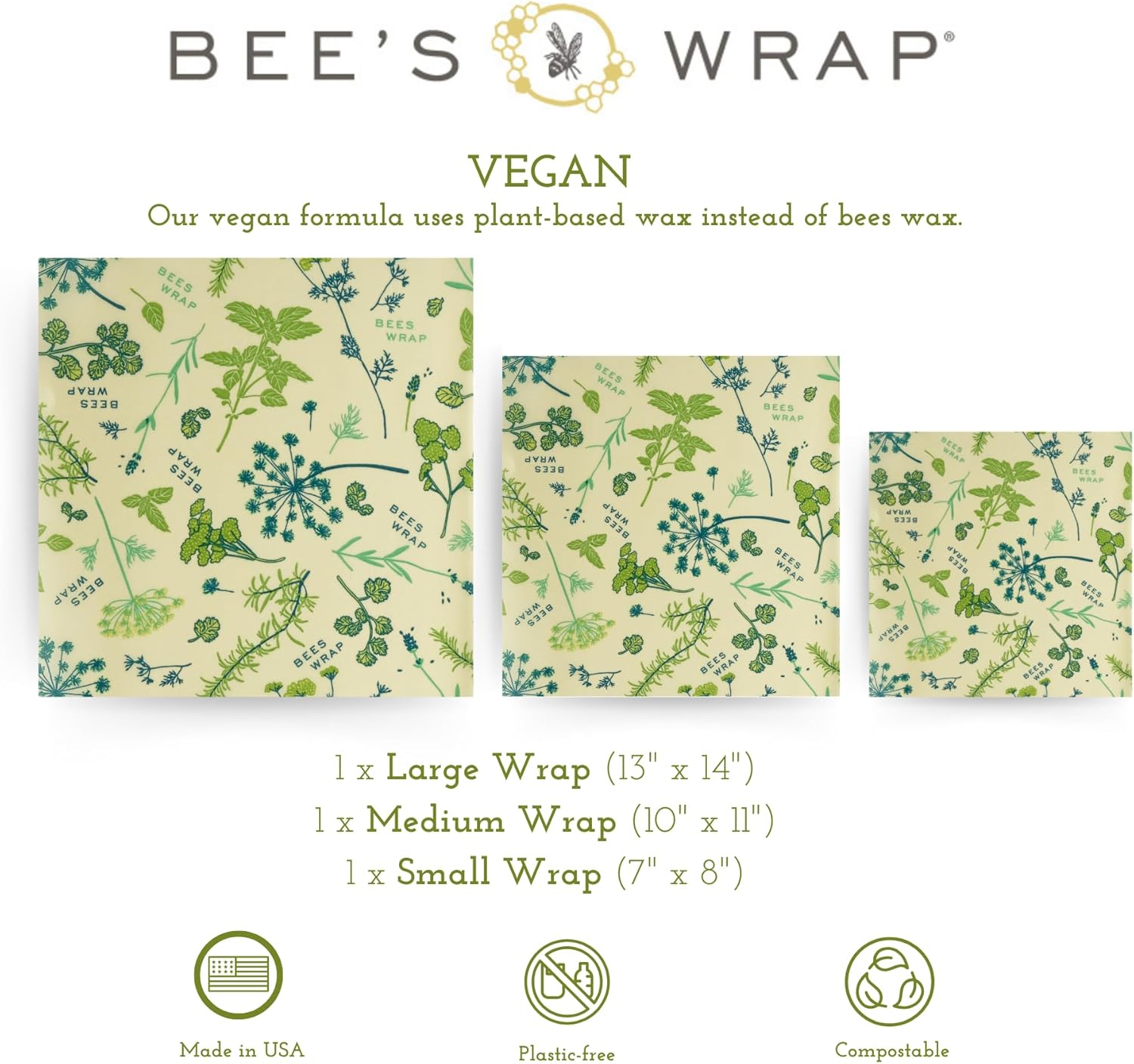 Bee's Wrap Vegan Beeswax Wraps for Food - Vegan Herb Garden 3 Pack (S, M, L) Made in USA Reusable & Organic Food Wraps, Sandwich Wrap & Bowl Covers - Eco Alternative to Aluminum Foil & Plastic Wrap