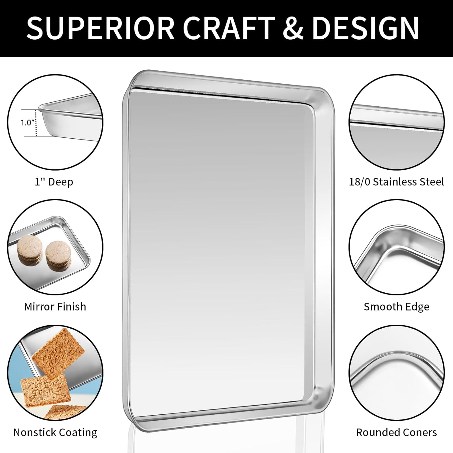 - DISHWASHER SAFE & EASY CLEAN: Stainless steel baking sheet with wire rack is smooth, non-sticky and mirror finish, so when cleaning small rimmed baking sheet, gently scrub with soapy water only. And as long as you fully remove any oil/grease each use, baking sheet with rack and baking mat will remain bright and clean. And these sheet pans with wire rack are all dishwasher safe, too