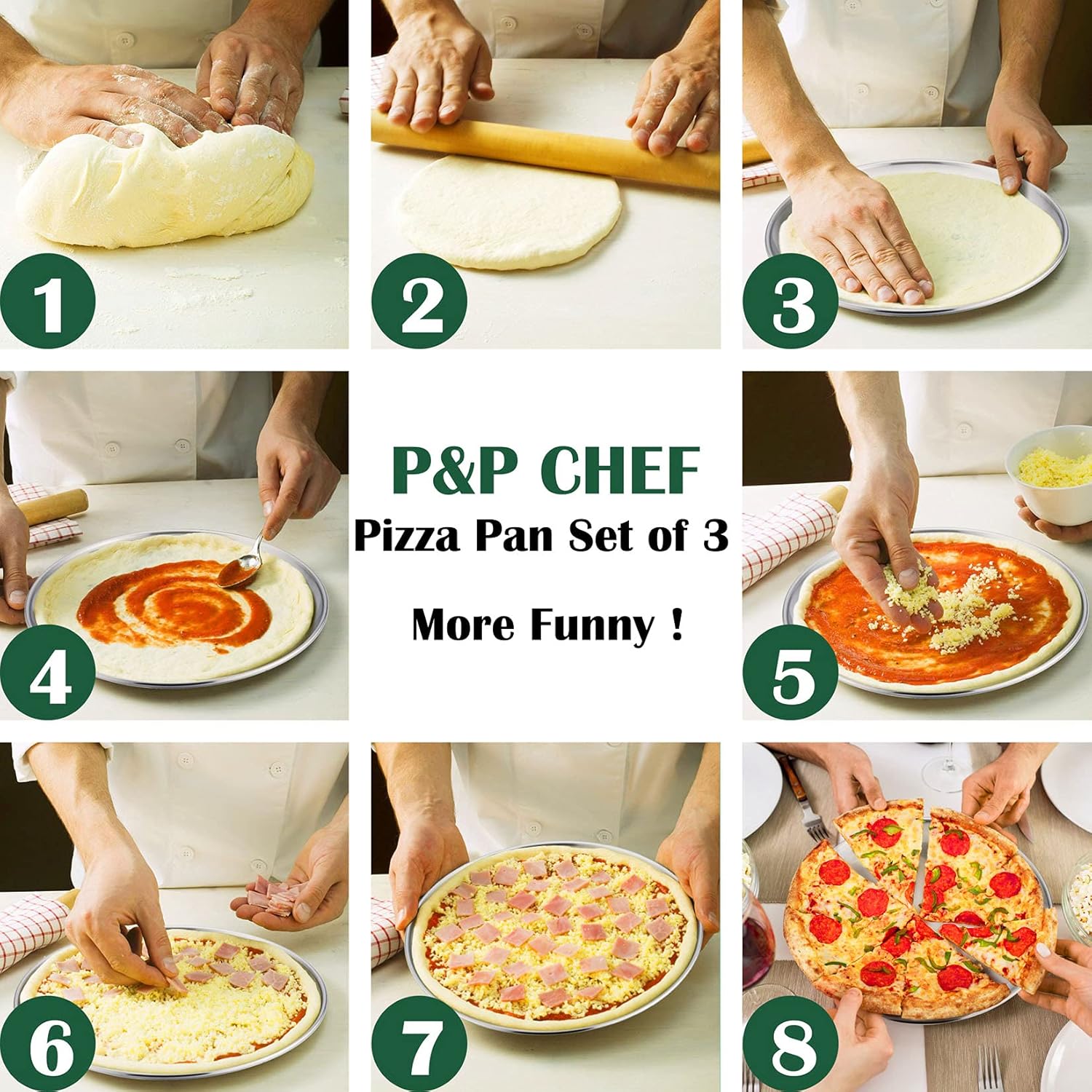 P&P CHEF 12 + 12 + 13.5 Inch Pizza Pan, 3 Pieces Stainless Steel Round Pizza Tray Dish Plate For Oven Baking Roasting, Healthy & Heavy Duty, Rust Free & Dishwasher Safe -Silver
