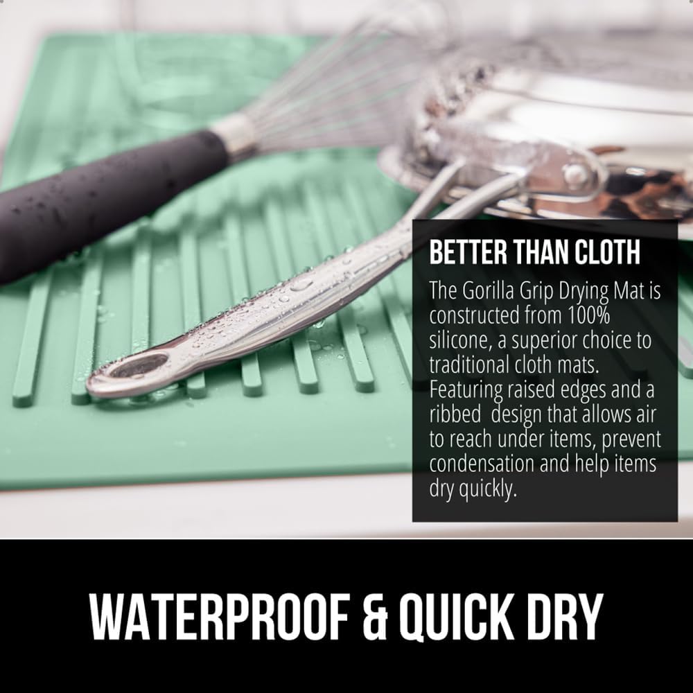 GORILLA GRIP 100% BPA-Free Patented Silicone Dish Drying Mat for Kitchen Counter, 18x16 Inch, Water Catching Ribbed Design, Easy Clean Waterproof Sink Liner, Heat Resistant, Fits Under Rack, Mint