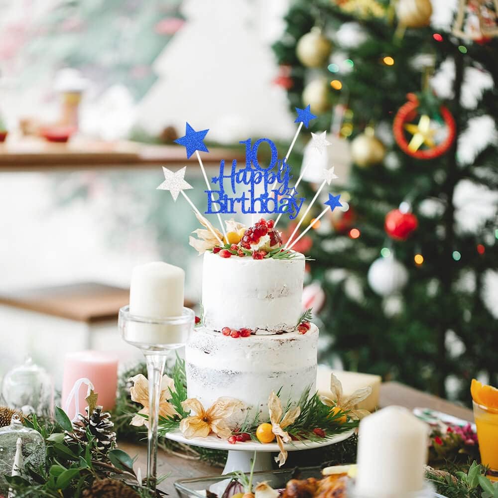 Glittery 10th Cake Topper with Star Boys and Girls 10th Birthday Party Supplies, Ten Years Old Birthday Party Decorations Royal Blue