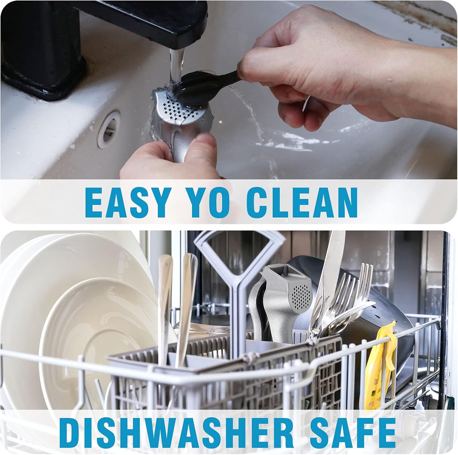 - 【EASY TO CLEAN】 With the design of non-stick surface, simply rinse your garlic mincers under running water or place in dishwasher for thorough cleaning. The brush provided in the package can also assist in cleaning. Clean up could not be any easier. Cleaning tool stores in the handle so it wont get lost.