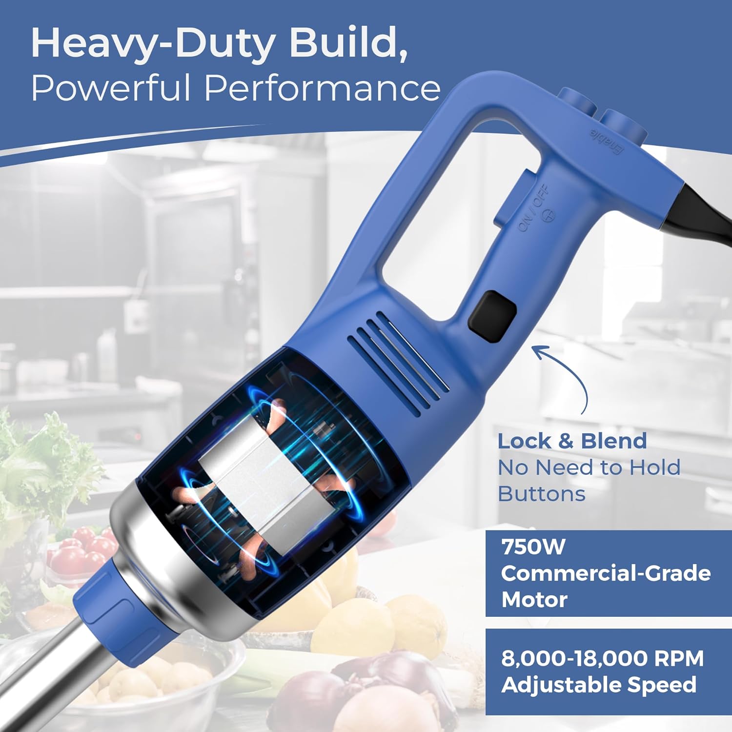 - The 750W (1 HP) heavy-duty immersion blender delivers 8,000–20,000 RPM, making it the ideal commercial immersion blender for thick sauces, dense mixtures, and high-capacity blending tasks in restaurants and professional kitchens.