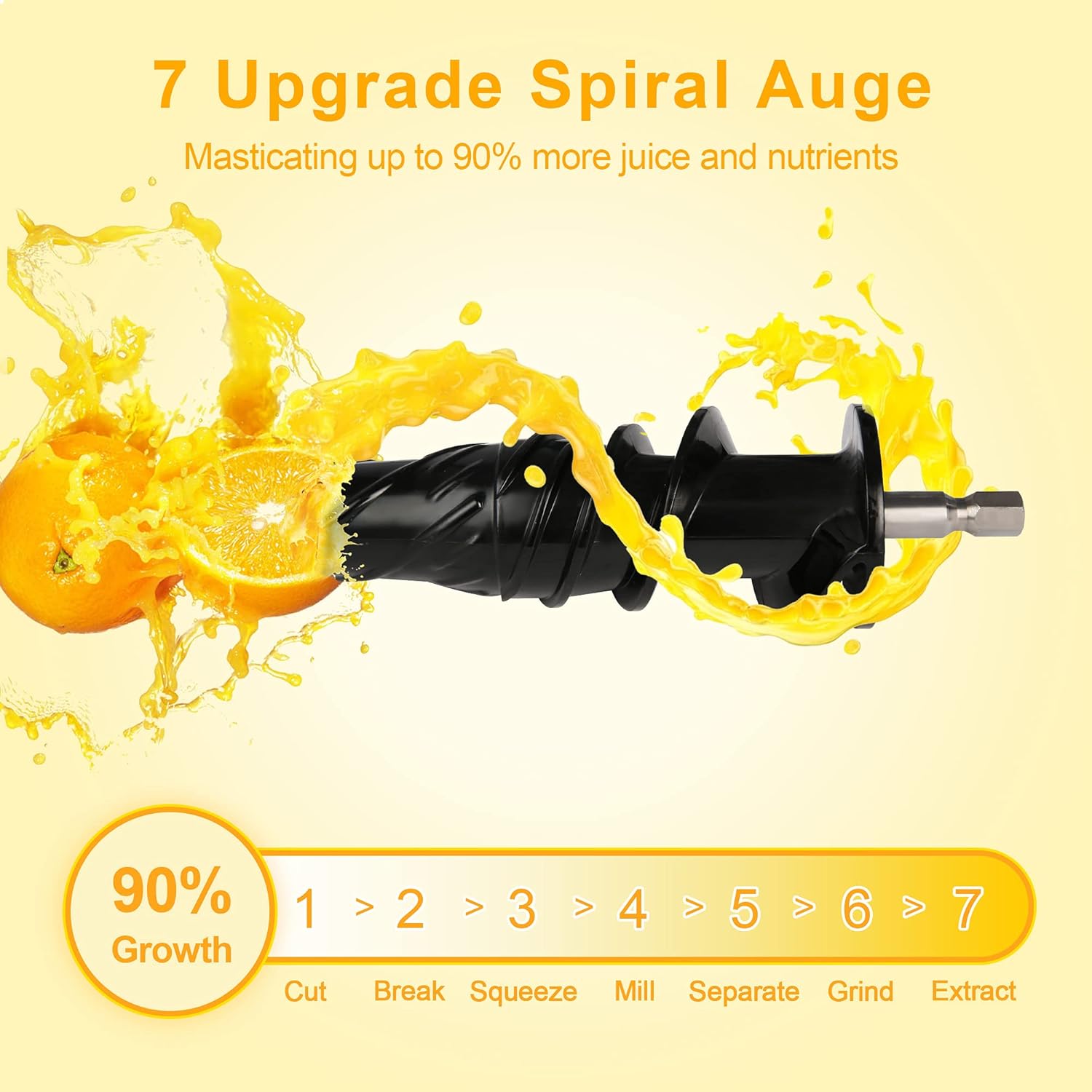 - 【Upgraded Masticating Juicers & Quiet Performance】The upgraded spiral auger increases juice yield while retaining more nutrients and minimizing oxidation. The motor operates at less than 60 dB, ensuring a quiet juicing experience. It also automatically shuts off after 20 minutes of use for safety and energy efficiency