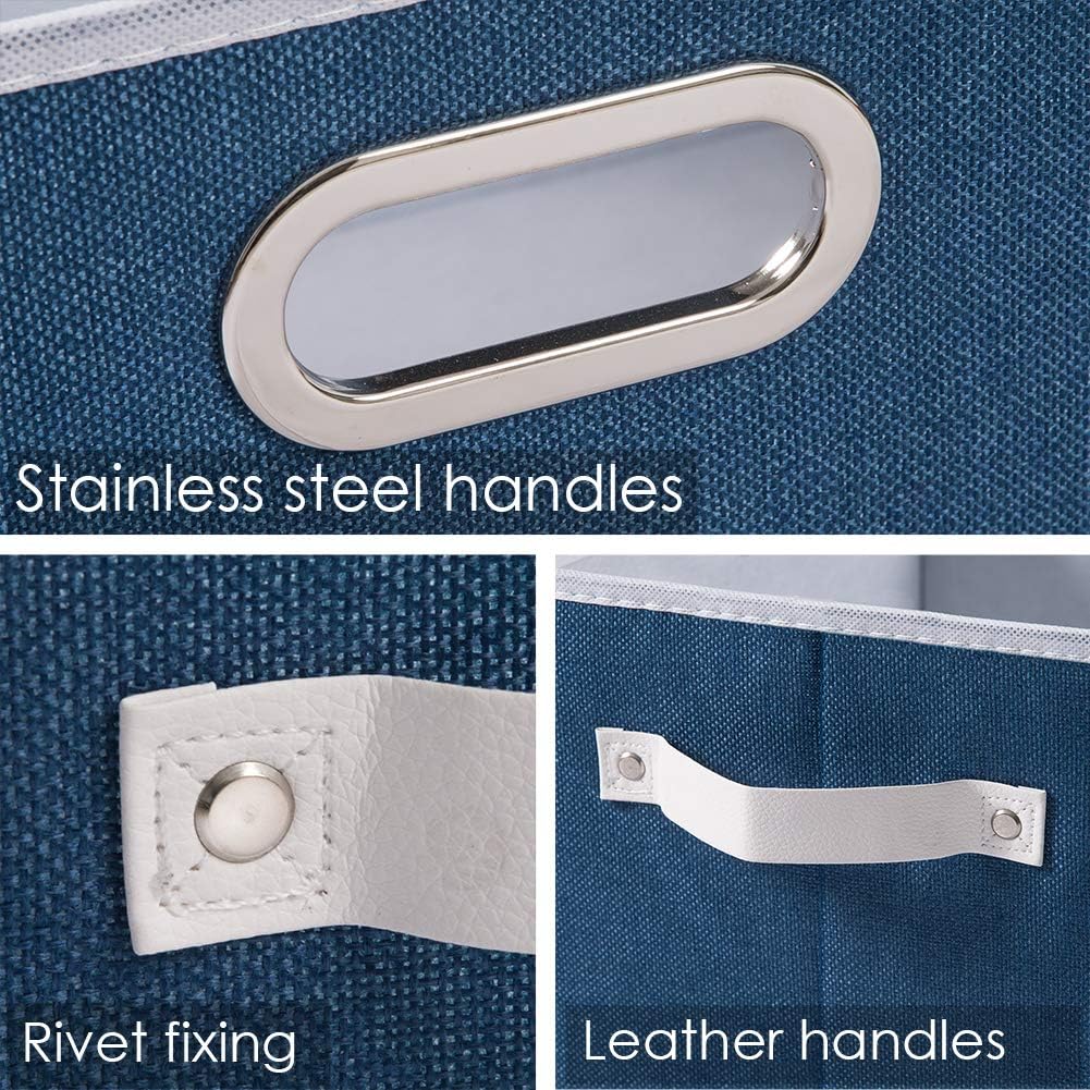 PRANDOM Larger Collapsible Storage Bins for Closet [5-Pack] Decorative Linen Fabric Storage Baskets Cubes with Leather/Metal Handles for Living Room Royal Blue (17.3x12.2x10.4 Inch)