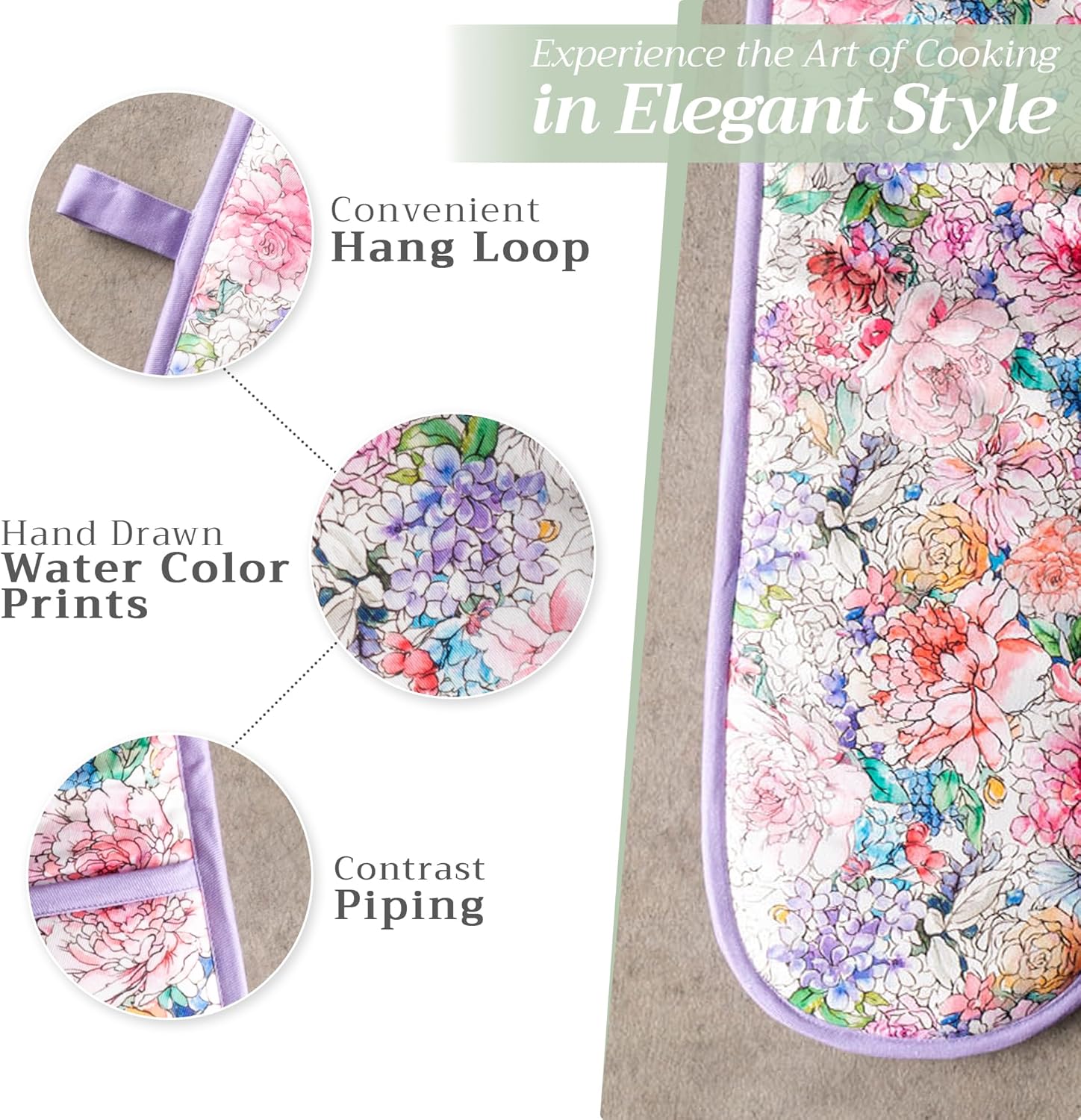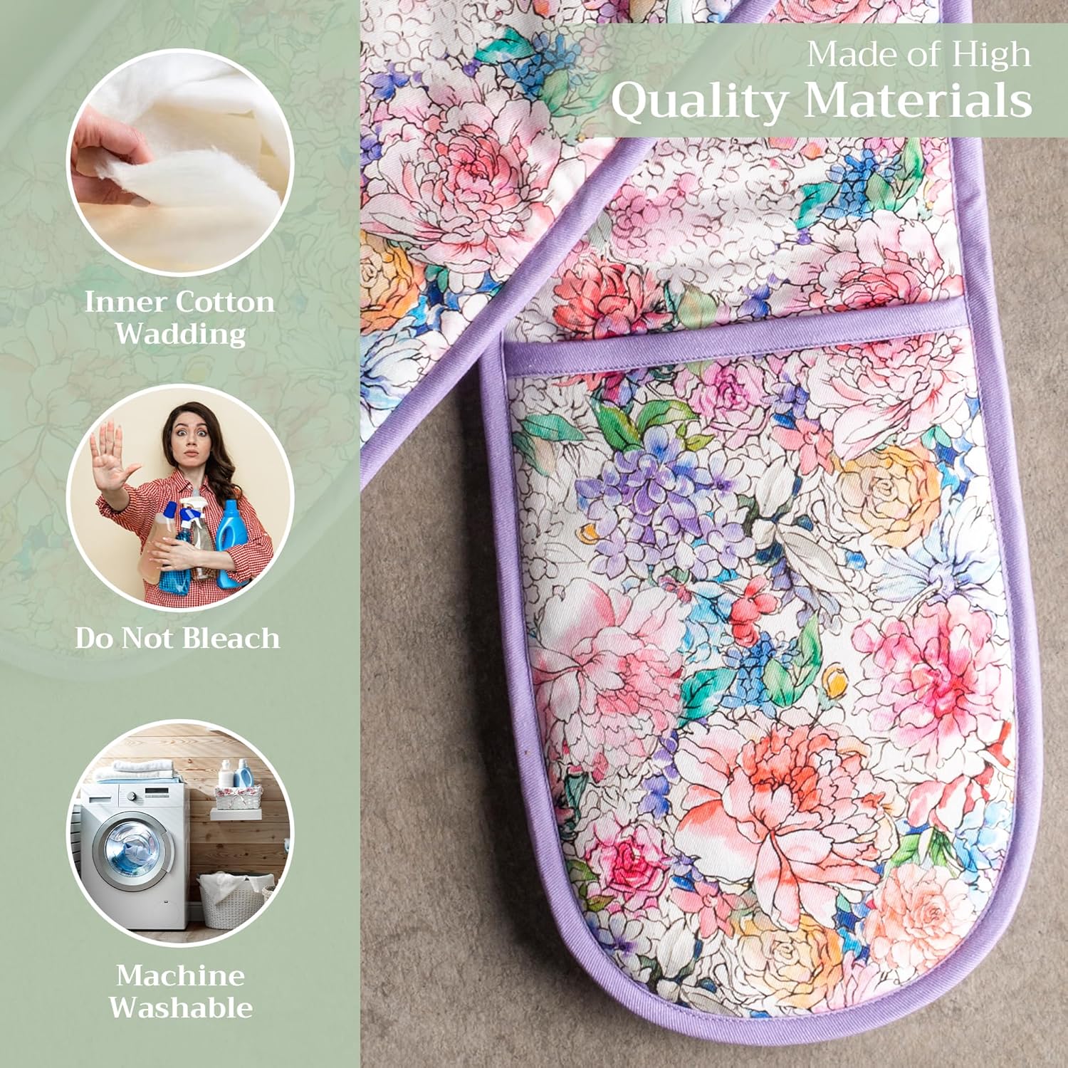 Maison d' Hermine Double Oven Mitts 100% Cotton 7"x35" Double Oven Mitt Heat Resistant BBQ Cooking Gloves with Loop, Baking, Grilling, Home, Kitchen, Handling Hot Pans Spring Summer (Floral Love)