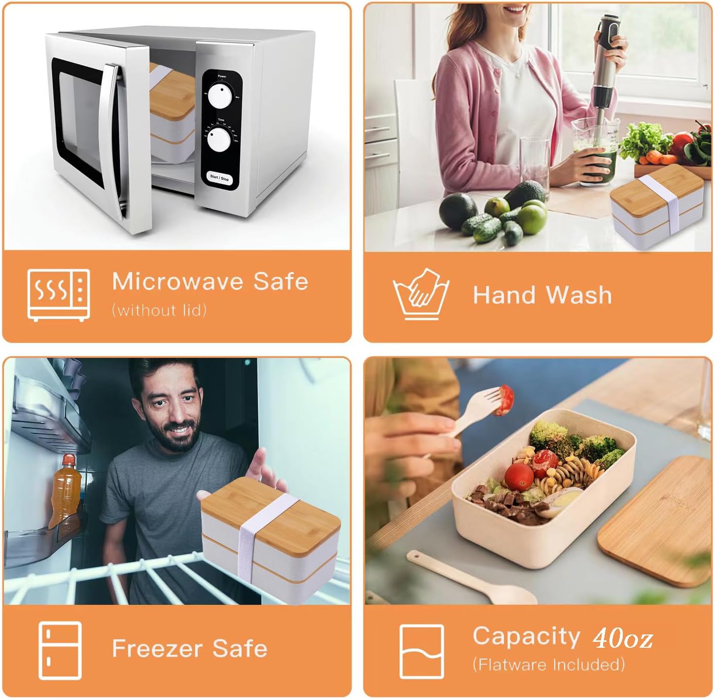 Japanese Bamboo Bento Box with Compartments and Utensils Stackable Lunch Box Includes Lunch Bag for Meal Prep Beige
