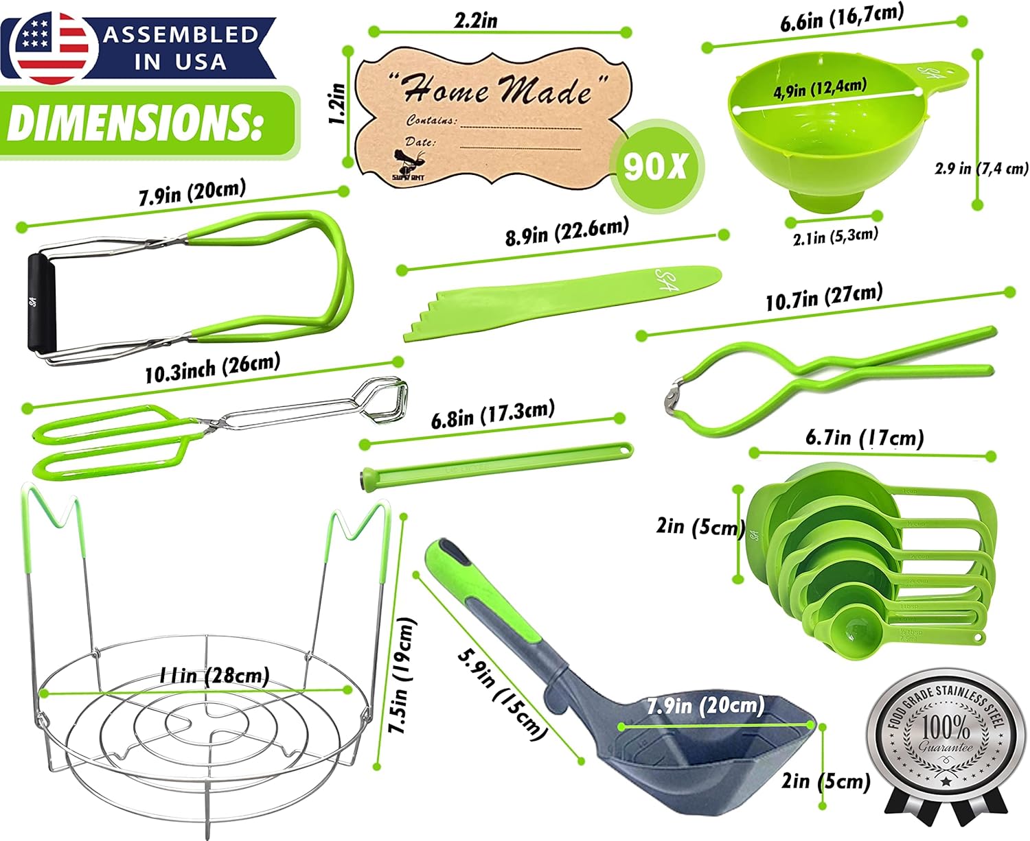 Supa Ant Canning Supplies Starter Kit- Canner Accessories with Canning Rack for Jars, XL Ladle,Wide Mouth Jar Funnel,Jar Lifter and Wrench,Bubble Popper/Measurer,Lid Lifter,Kitchen Tongs (Light Green)