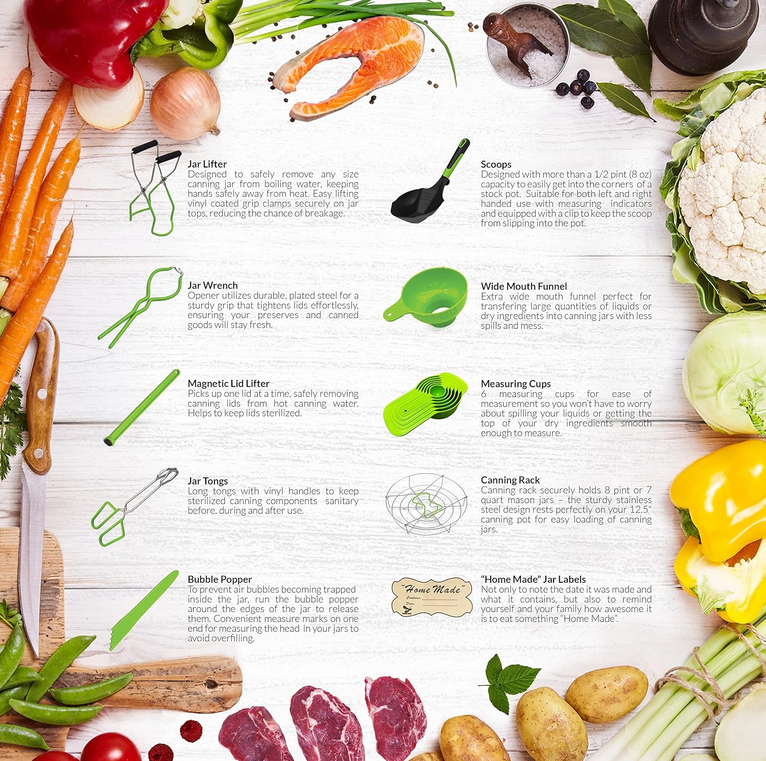 - All-in-one canning supplies: This home canning kit consists of all essential tools: canning funnel, jar lifter, bubble popper (measurer), magnetic lid lifter, jar wrench, canning tongs and a set of "Home made" labels to remind everyone of the hard work you have put in to make it :)