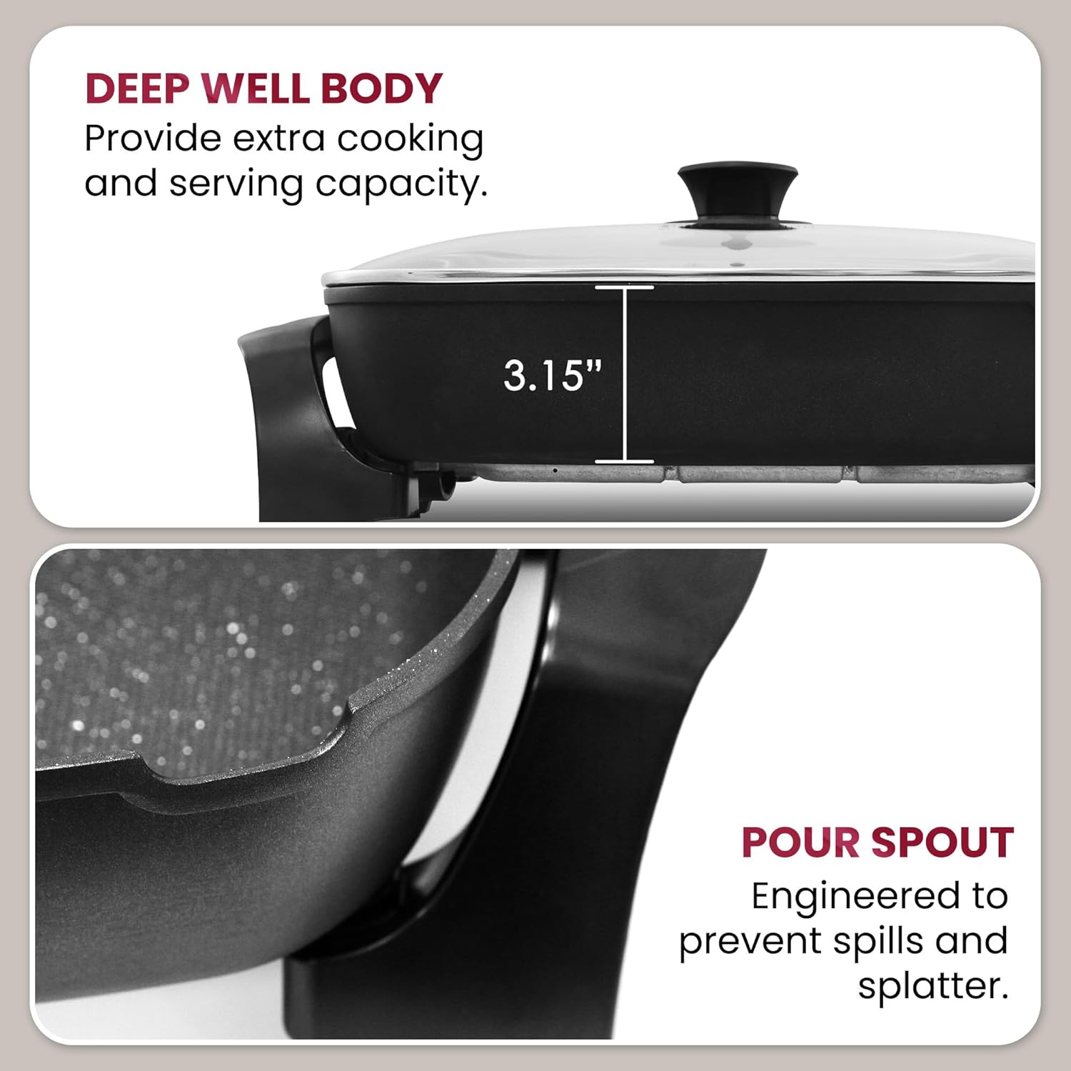 Elite Gourmet EG-6203# Extra Deep 16"x13"x3.2" (10.5Qt.) Scratch Resistant, Easy Pour Spout Dishwasher Safe, Non-stick Electric Skillet with Glass Vented Lid, Adjustable Temperature, Black