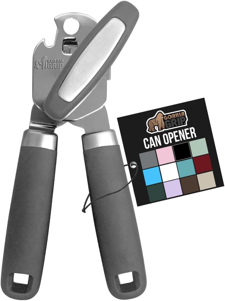 GORILLA GRIP Heavy Duty Stainless Steel Smooth Edge Manual Can Opener and Bottle Openers, Soft Comfortable Handle, Oversized Handheld Turn Knob, US Designed Multifunctional Kitchen Tool, Gray
