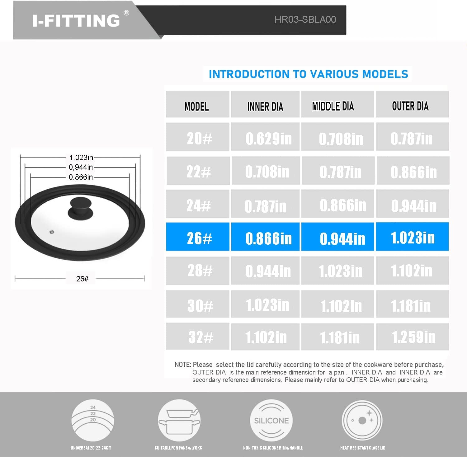 - 【UNIVERSAL LID WITH STEAM VENT】 Universal silicone glass cover lid suitable for pan/pot/skillet/saucepan/frying pan/soup pot , can fit 8.5", 9.5”, 10” (22, 24, 26CM ) cookware. Designed with stainless steel steam vent, effectively prevent overflow during cooking