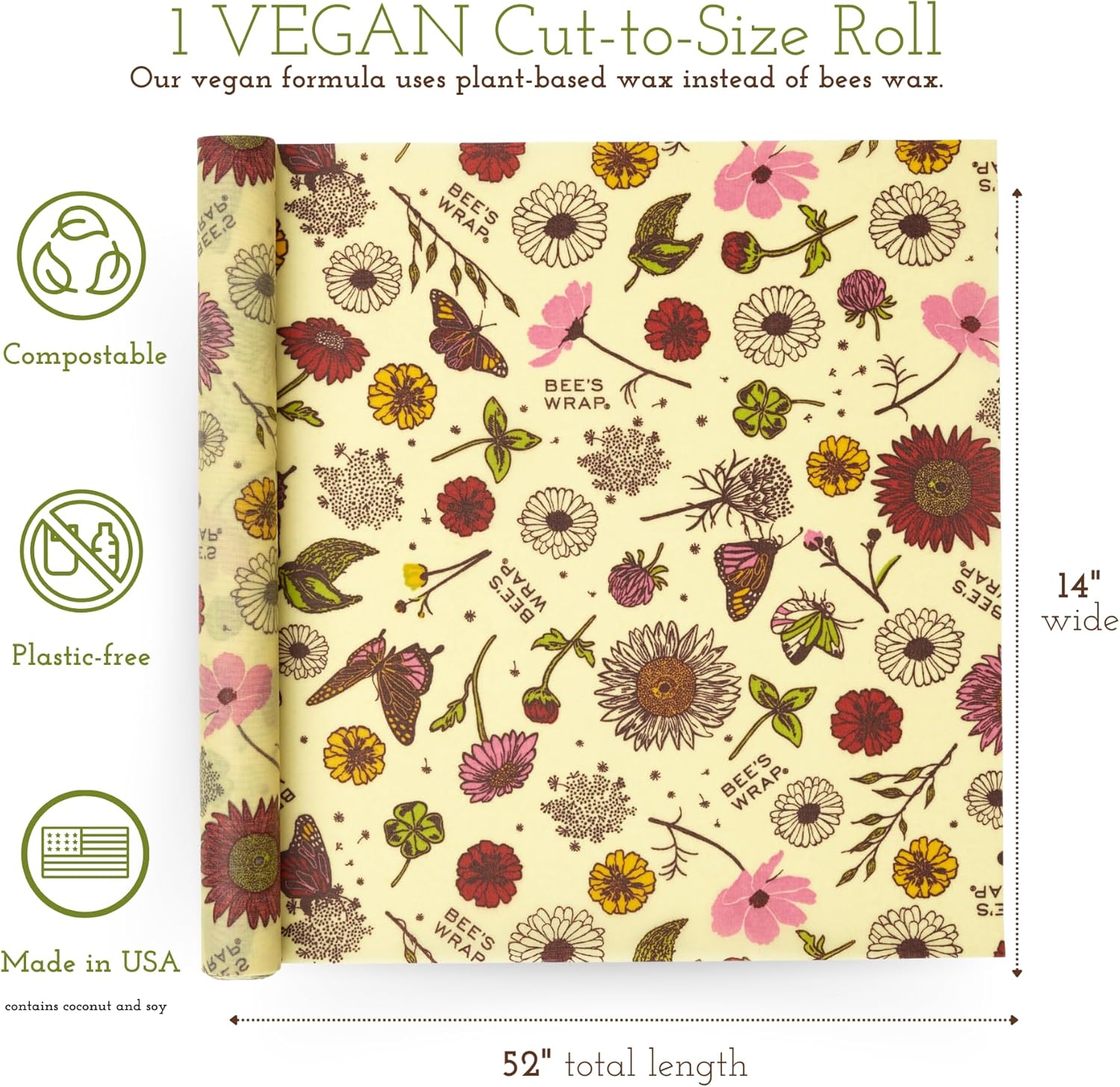 - VEGAN BEESWAX WRAPS FOR FOOD in a large 14" x 52" wax paper roll featuring a colorful butterflies and flowers design. Made in USA reusable vegan food wraps are a great alternative to single use plastic wrap, sandwich wraps, and aluminum foil.
