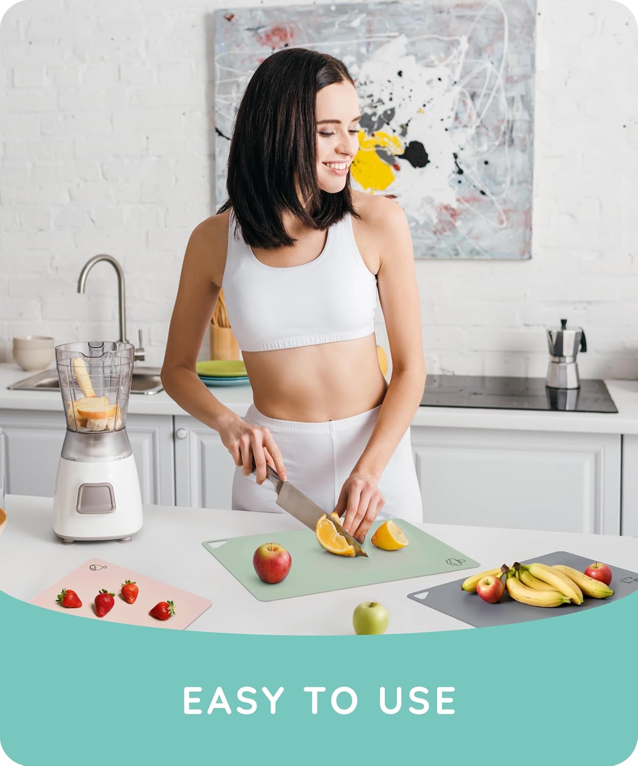 - 🧼 EASY TO CLEAN, DRY & STORE! Сutting boards for kitchen use are just what you’ve been looking for! The compact design of our 3 piece mat board set takes the load out of cooking. Chop, slice, and dice confidently with cutting mats for cooking that are sure to stay in place as you prep.