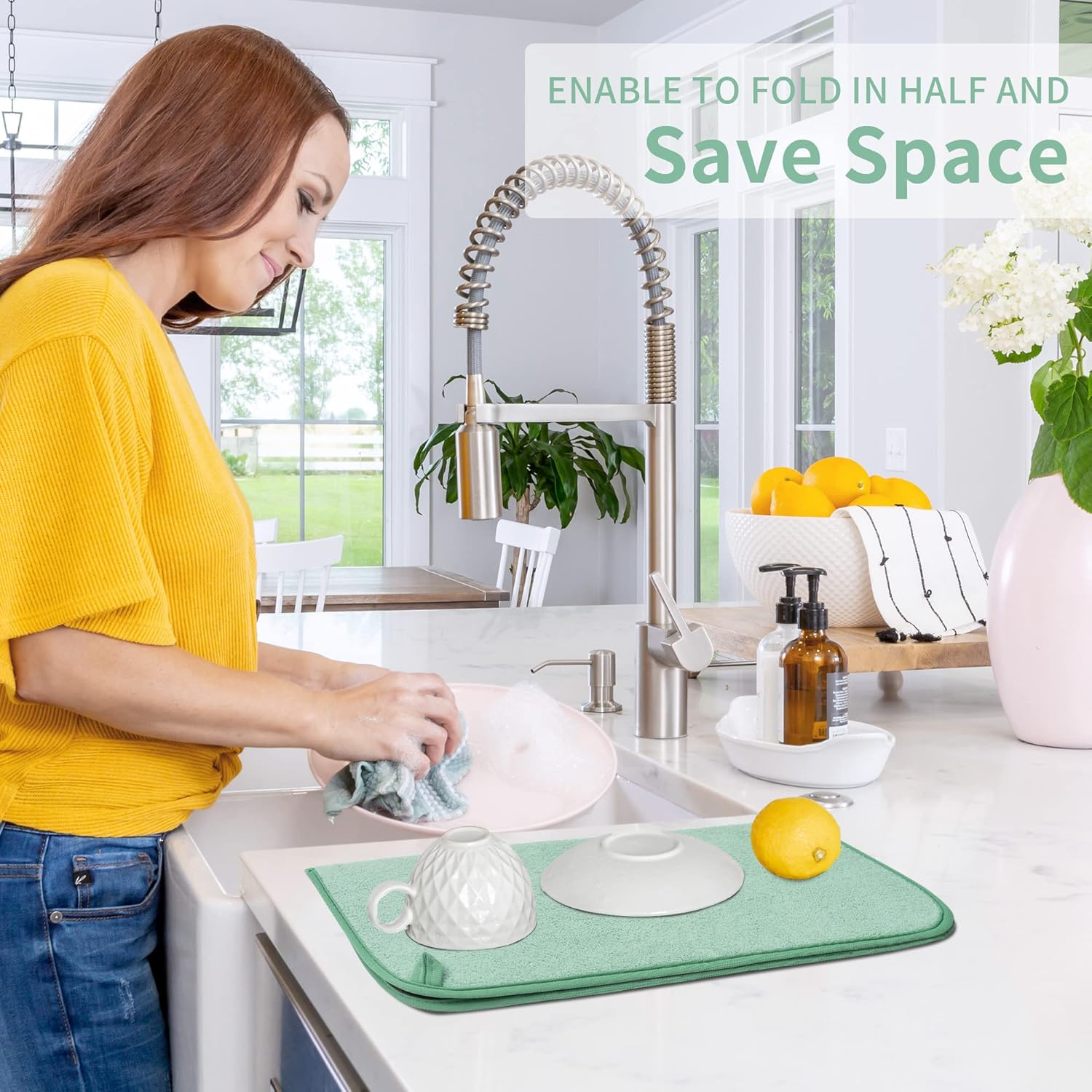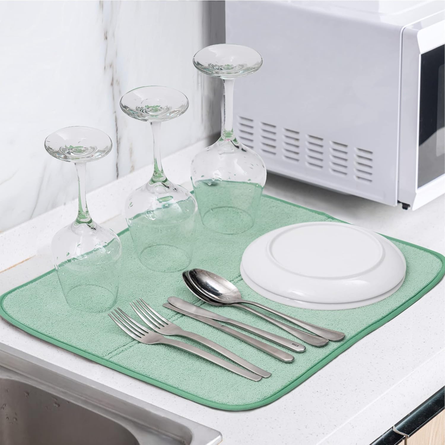 - Absorbent & Durable: The Dish Drying Mat is the revolutionary solution. Microfiber drying mat protects your counter from scuffs and scratches, the dishes drainer mats for the kitchen feature BPA-free, Eco-Friendly, non-slip bottom leaving you & your family with safe, clean, and dry dishes.
