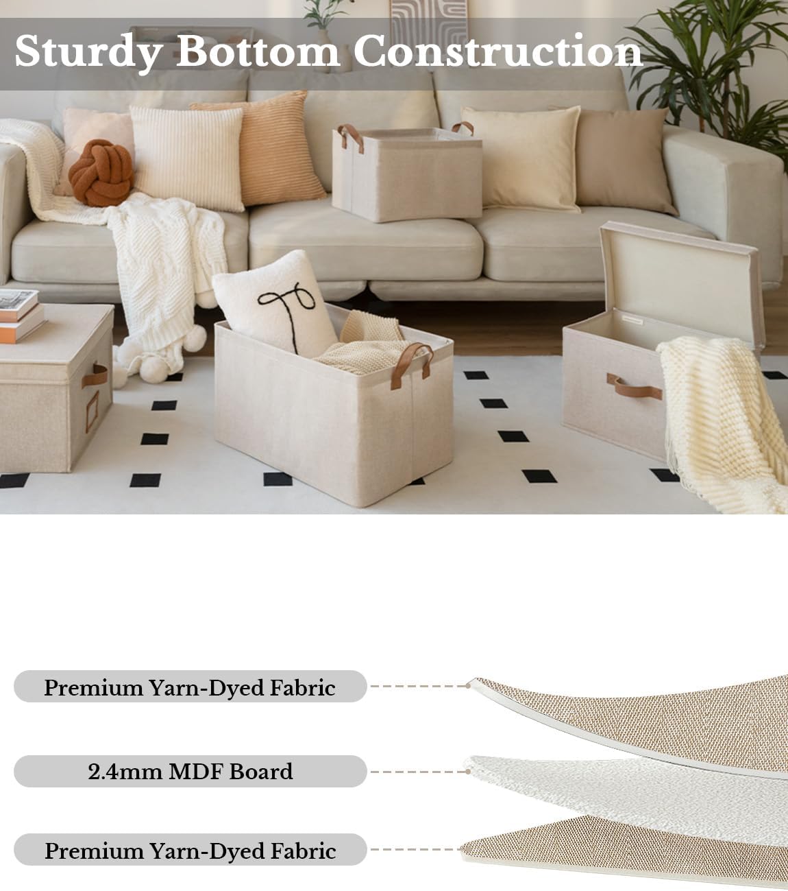 - Premium Quality: Made from high-quality fabric and reinforced with a heavy-duty MDF bottom board and a sturdy metal frame. The solid construction enables the storage bins to stand upright without support, even when empty.