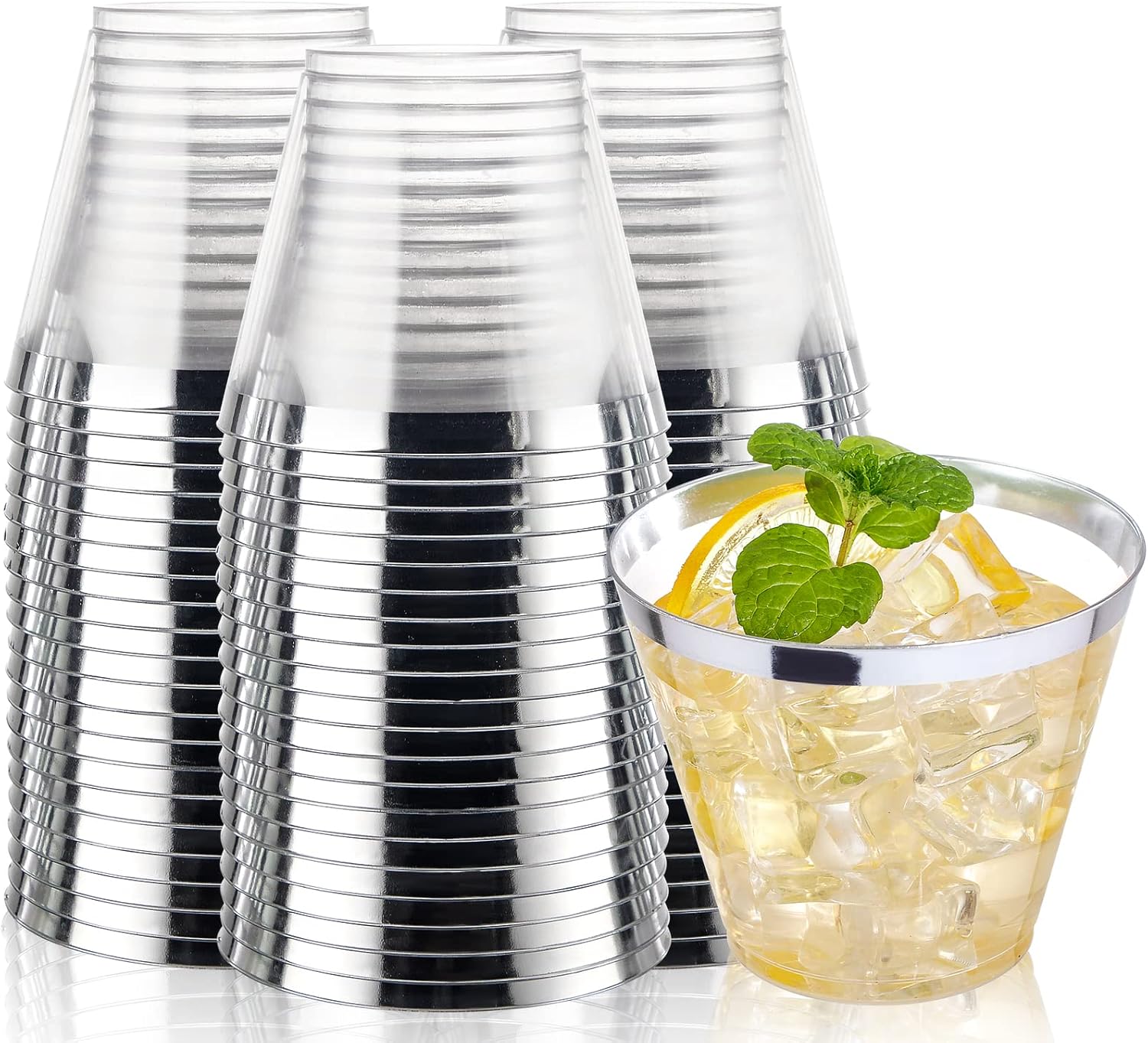 - Space Saver: Our shiny crystal silver rimmed fancy hard plastic cups are easily stackable to help you save storage space. Perfect for parties, catering, restaurants, bar supplies and Thanksgiving.