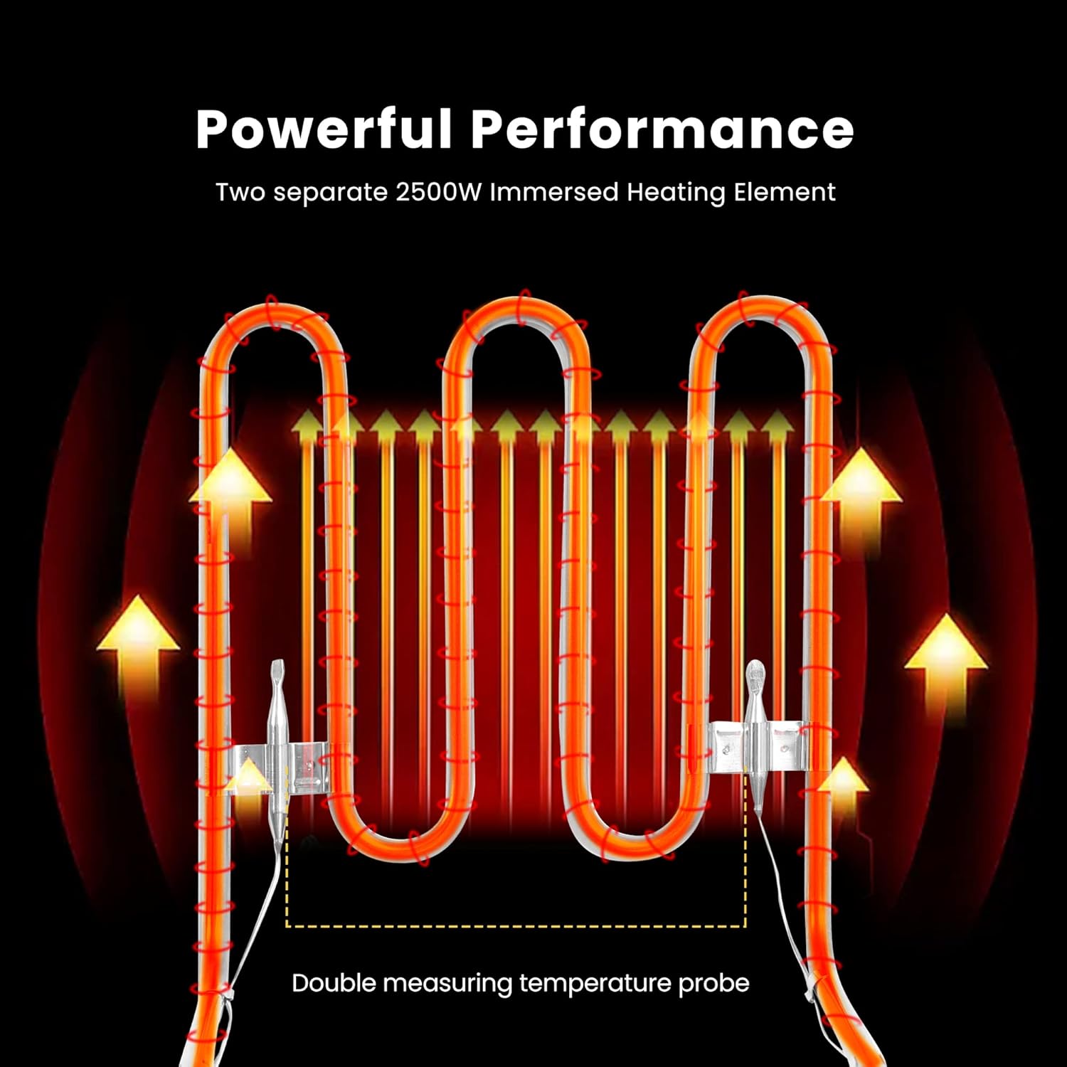 - POWERFUL PERFORMANCE - 2 separate 2500W fryer basins ensure frying the food quickly; The double deep fryer not only performs well for home use but also is perfect for commercial use, such as fast food stands, restaurants, supermarkets, snack bars, etc.; Suitable for frying chips, fish, chicken, doughnuts, fritters, onion rings, shrimp, French fries, etc.