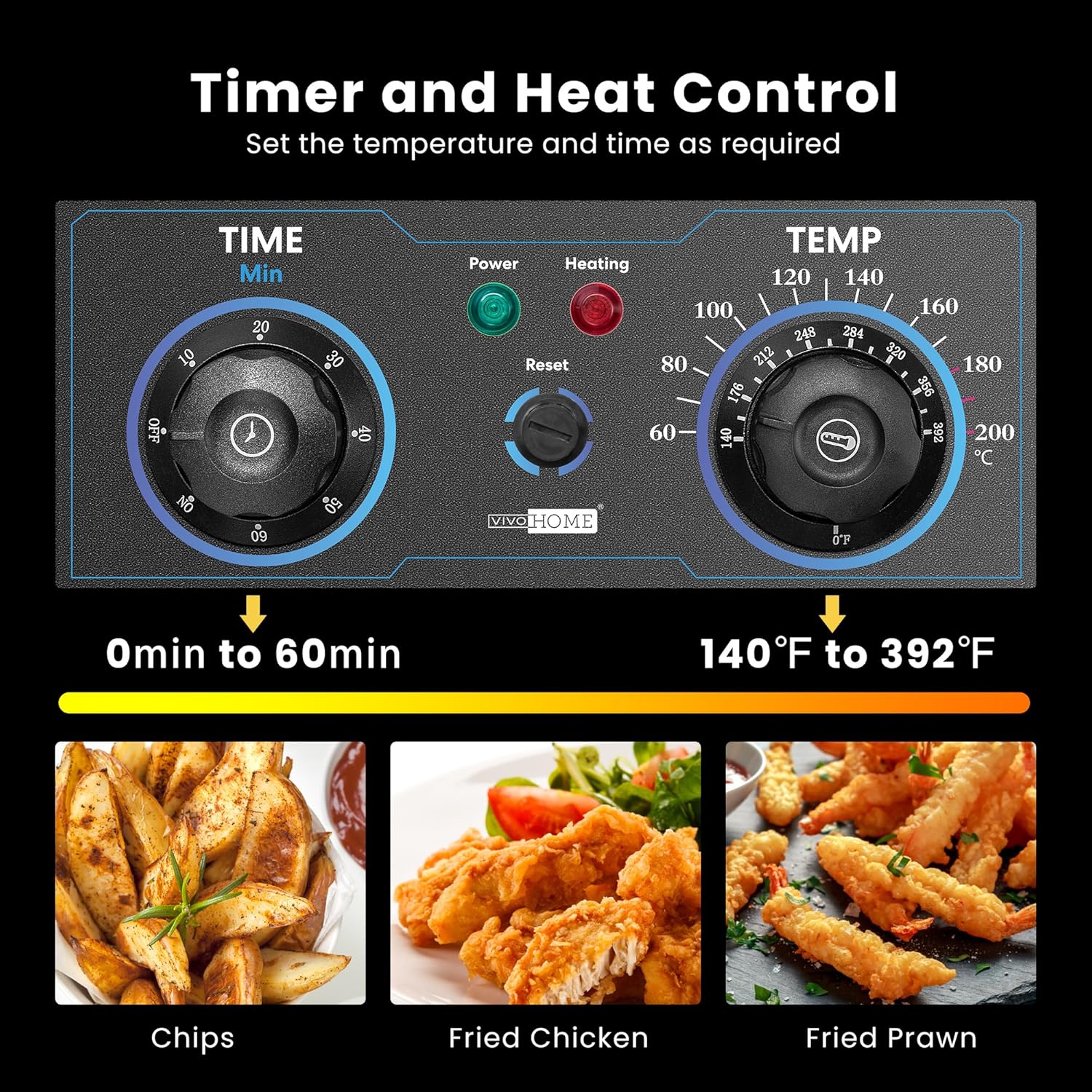 - TIMER AND HEAT CONTROL - The VIVOHOME upgraded commercial deep fryer comes with adjustable 140°F to 392°F temperature control and 0-60 minutes free setting timer with automatic shutoff ; The signal bell not only saves your energy and time but also helps you fry the food with the crispy outside but tender inside