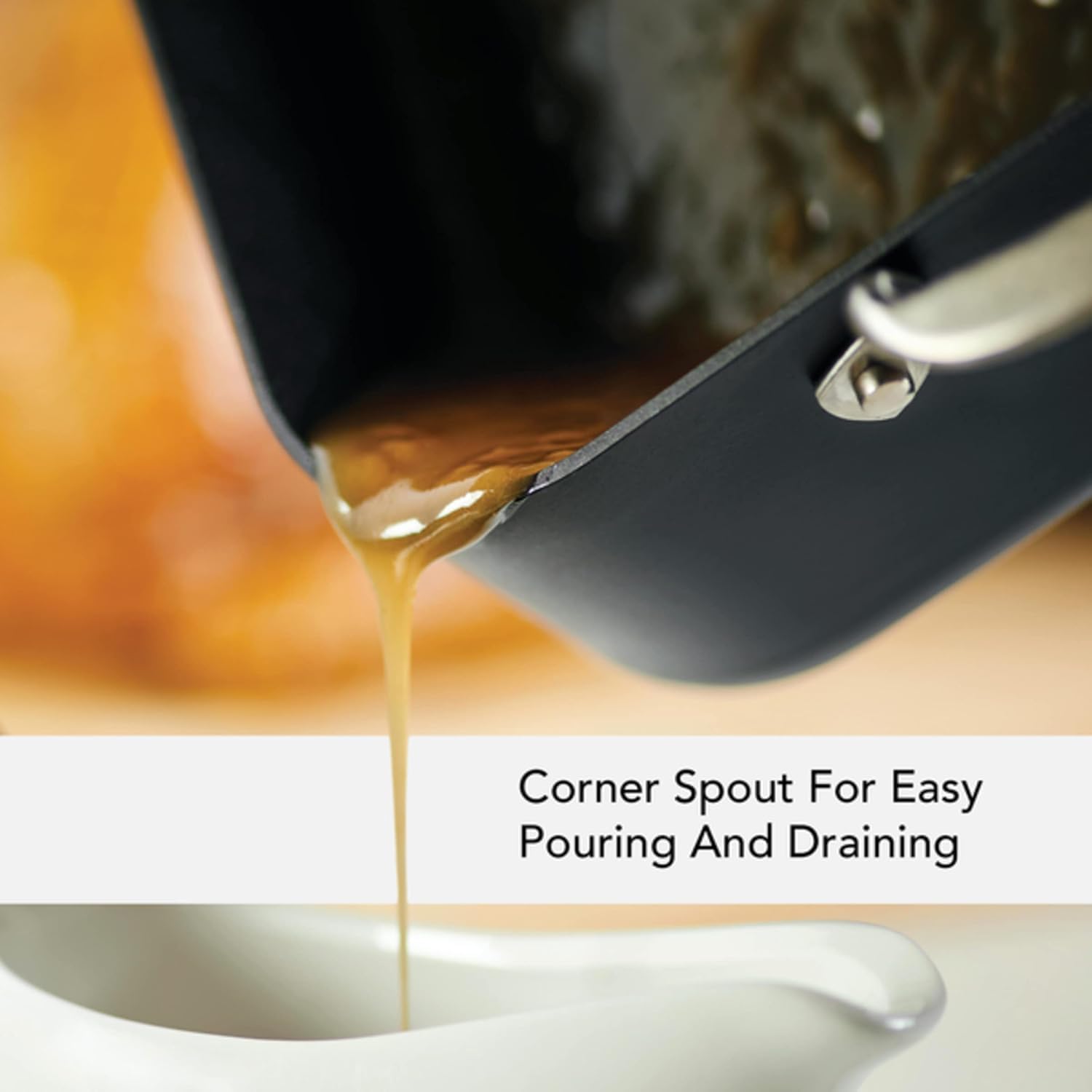 - BUILT-IN POUR SPOUT: Nonstick pan features a built-in corner spout to easily pour juices and homemade gravies