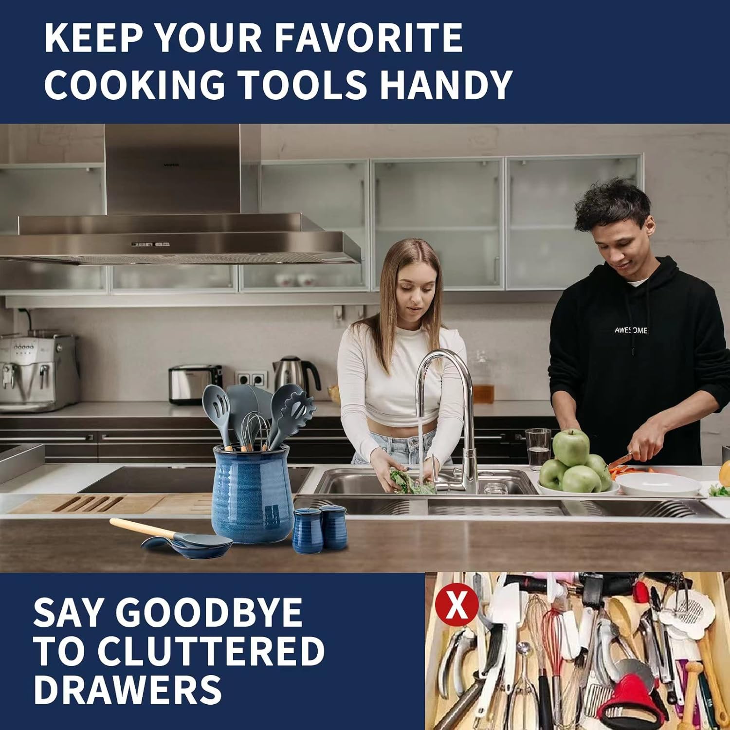 - VERSATILE Uses: The blue countertop design adds a unique retro style to your kitchen. Elegant navy blue kitchen utensil organizer can also be used as a wine cooler, makeup brush holder, flower vase, plant pot, or simply as a kitchen decoration.