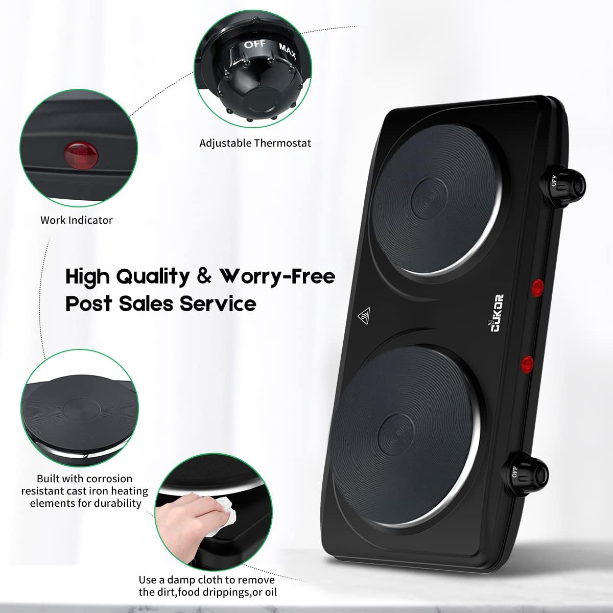 CUKOR Electric Hot Plate, Double Cast Iron 2 Burner, 1800W Countertop Burner, Dual Electric Stove Burners, Portabel Electric Cooktop, Portabel Double Burner for Cooking