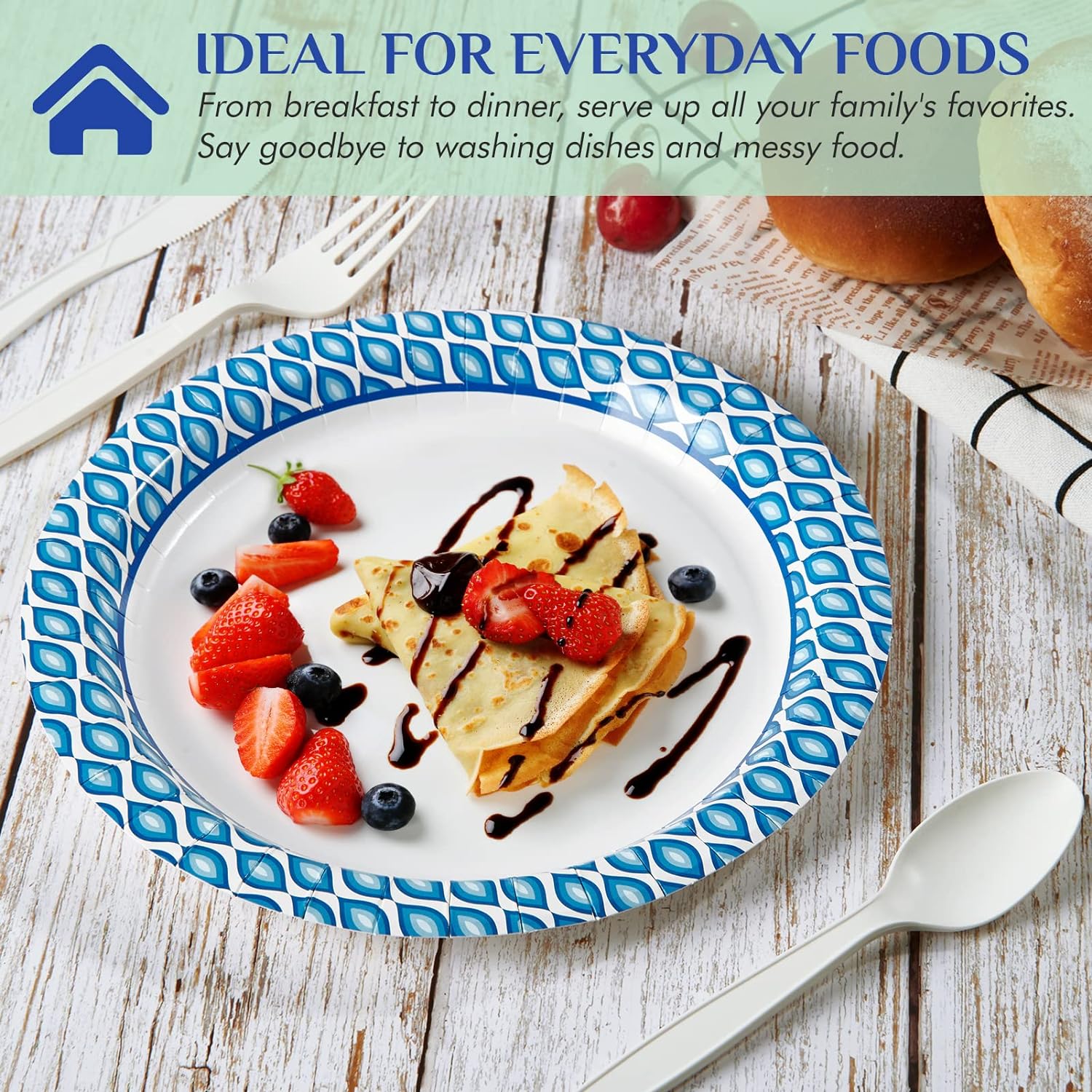 - 10 Inch Paper Plates: These paper plates bulk are durable and cut resistant. With Bule print on the edges. And the soak proof layer on the surface, keeping greasy foods from soaking through