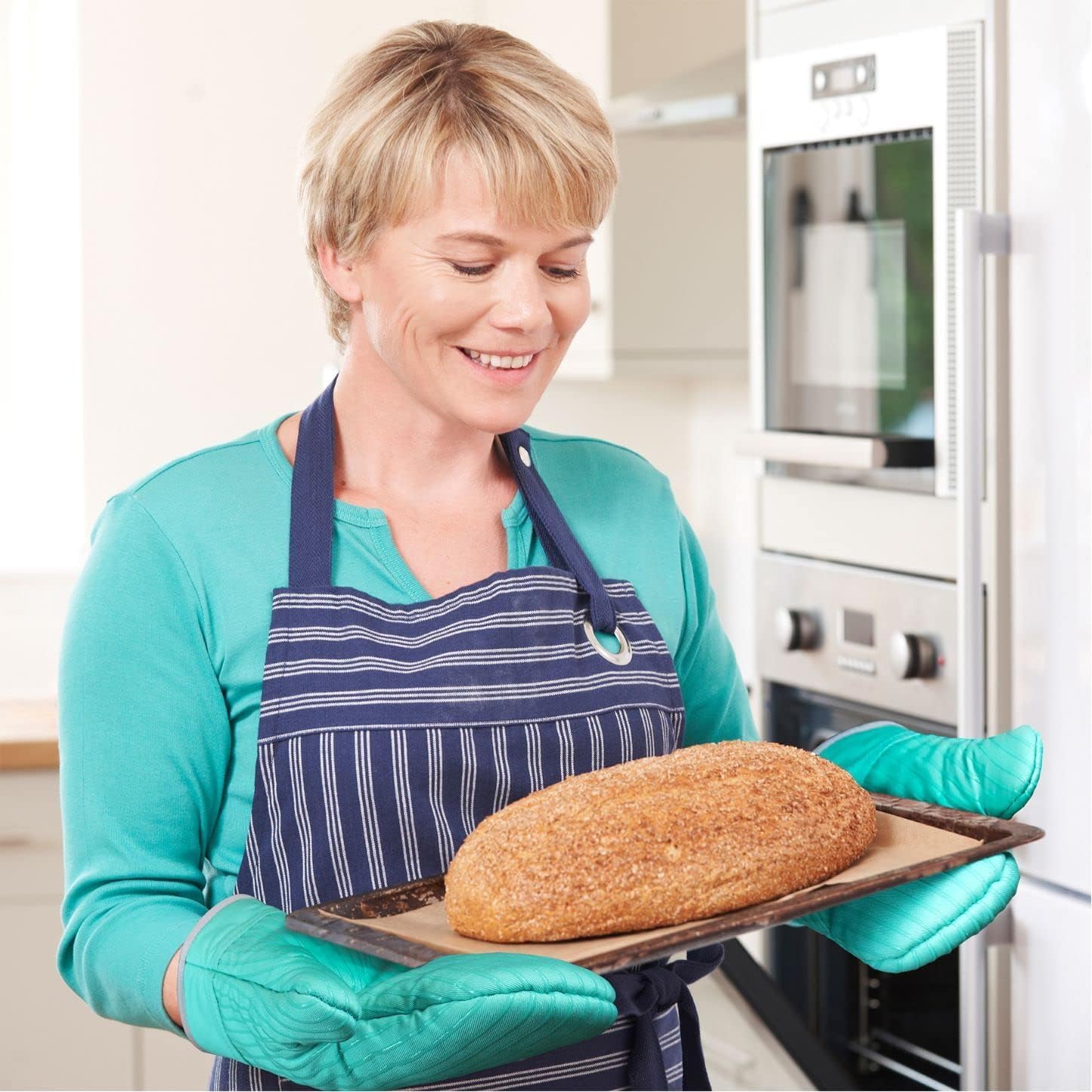 - SUPERIOR HEAT RESISTANCE & NON-SLIP GRIP: Our oven gloves are crafted with a durable cotton exterior. The thick polyester fiberfill insulation is quilted directly to the soft terry cloth inner lining, creating a secure thermal barrier that won't shift or bunch up. Exterior silicone grip strips ensure a secure, slip-free hold on hot and greasy items, preventing accidents