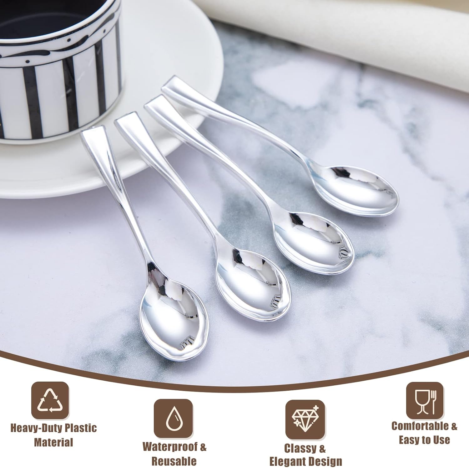 - ELEGANT DESIGN: Our mini spoons have the same luster as real metal, It looks more premium than other plastic spoons. Our ergonomic design is comfortable to hold. They make guests feel your taste.